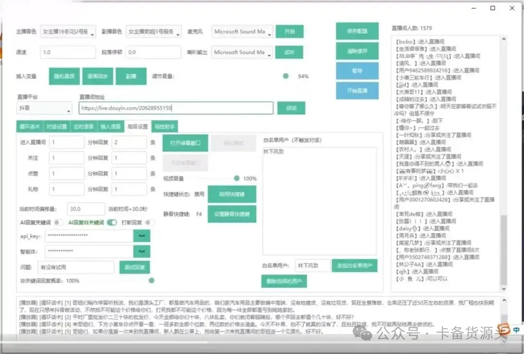 :实时插话 + 自动抓取公屏信息,智能回复点赞、礼物、进房、关注行为;支持自定义关键词语音回复,提升互动个性化。 -