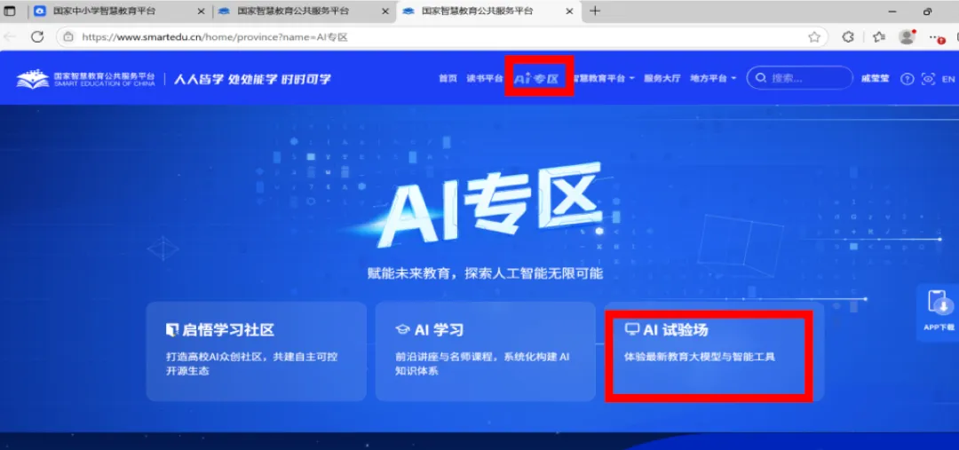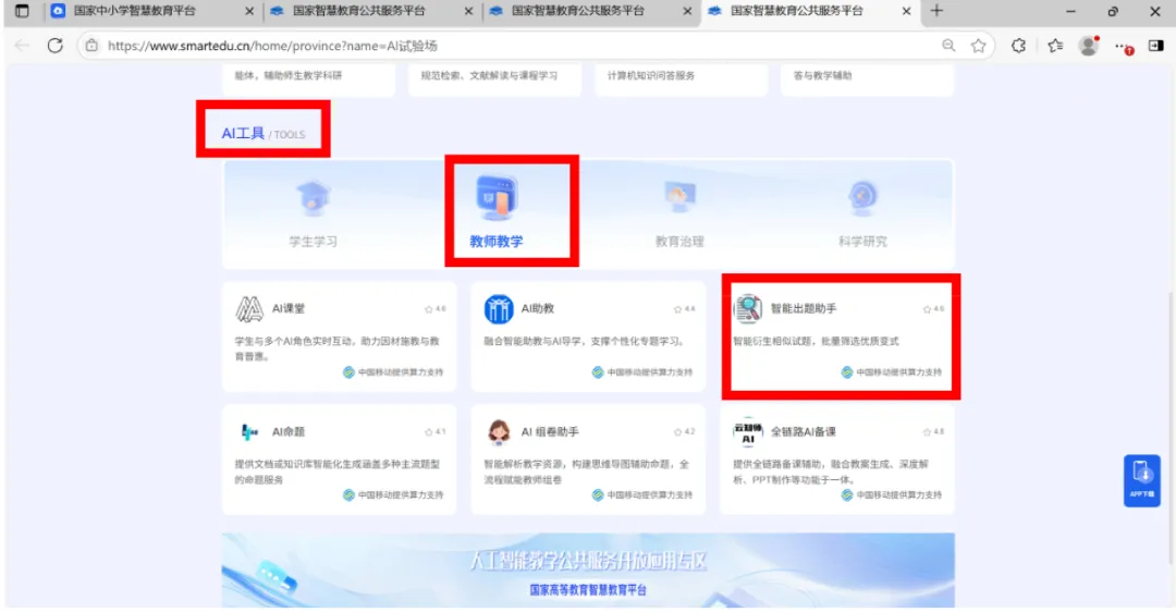 3.找到AI出题工具 使用国家中小学智慧教育平台账号登录,在顶部功能栏中找到并进入“AI专区”,点击进入“AI试验场”;下拉页面至“AI工具”,选择“教师学习”,即可找到“智能出题助手”。
