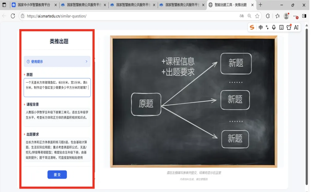 1.原题输入:直接复制粘贴学生高频错题、典型易错题、单元测试题或教材例题即可。例如:放入一道无盖长方体鱼缸表面积易错题,AI将自动按照同类题型与难度生成全新题目,避免原题重复。
