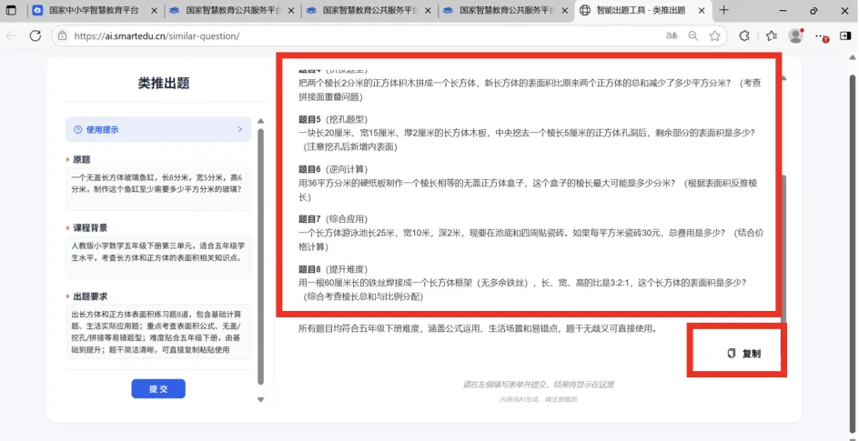 3.出题要求:描述越具体,出题效果越贴合教学需求。示例:出长方体和正方体表面积练习题8道,包含基础计算题、生活实际应用题;重点考查表面积公式、无盖/挖孔/拼接等易错题型;难度贴合五年级下册,由基础到提升;题干简洁清晰,生成后可直接复制粘贴使用。
