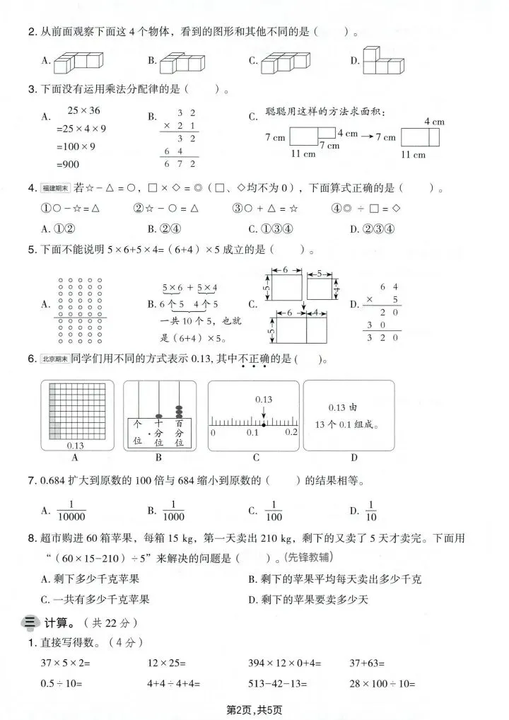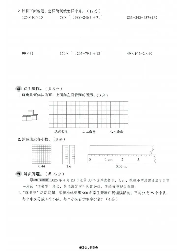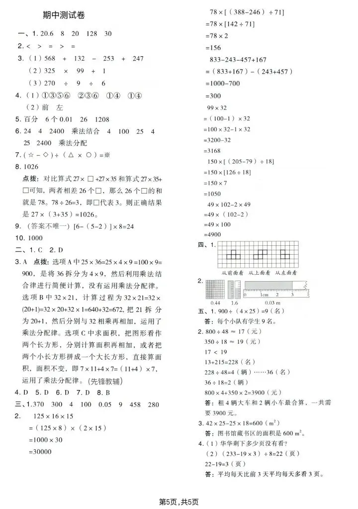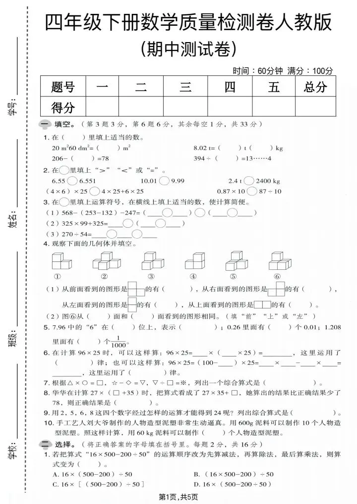 四年级下册数学 期中质量检测卷 电子版 可打印