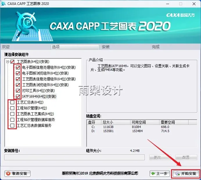 7.根据需求勾选需要的组件,点击【开始安装】(提示:如果没安装“工程知识管理”组件启动有弹窗,但不影响使用)