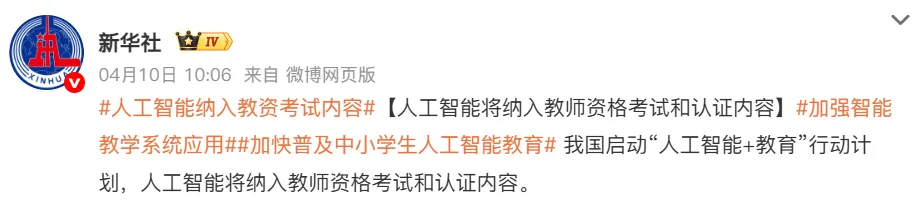 2026年4月10日,教育部等五部门联合发布《“人工智能+教育”行动计划》,人工智能正式纳入教资考试和认证内容。不会用AI辅助备课,不仅考试难过,日常教学也会越来越吃力。