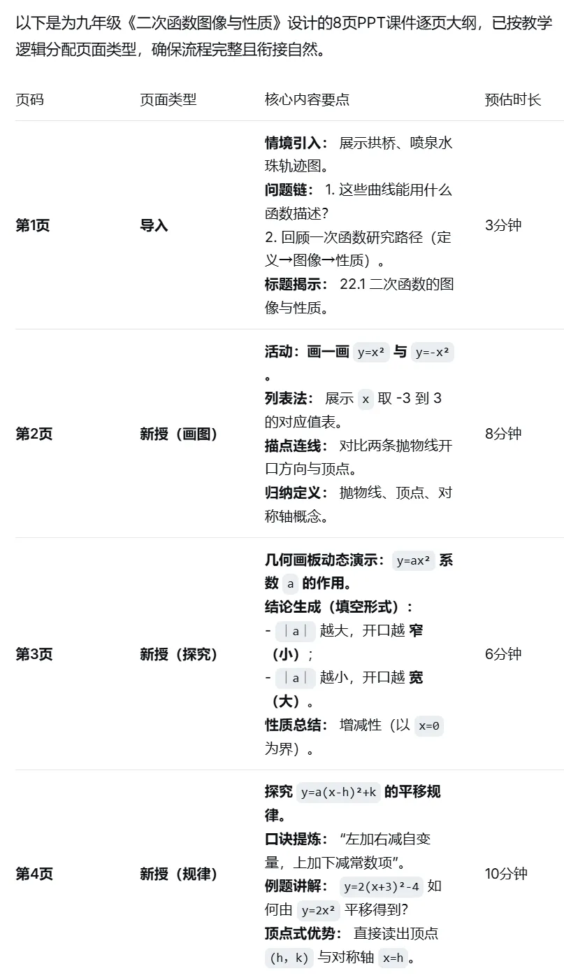 你是一位擅长做PPT课件的【学段】【学科】教师。请基于【课题】的教学流程,生成一份逐页课件大纲,共【数量】页PPT。用表格形式呈现,包含页码、页面类型(导入/新授/练习/总结)、核心内容要点、预估时长、过渡衔接语。