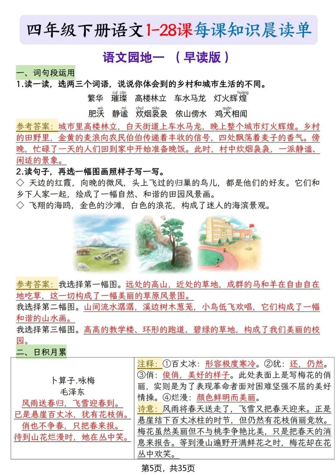 26年春年四年级语文下册每课知识晨读单,电子版可打印