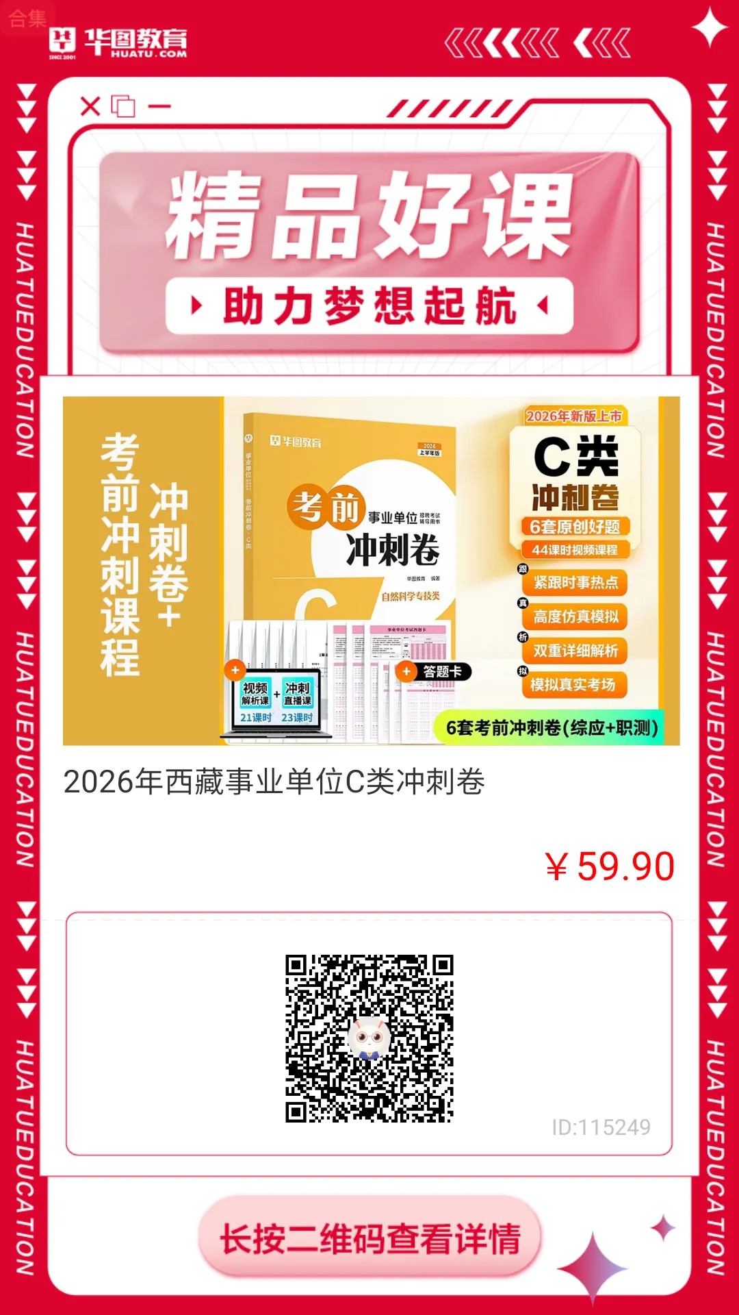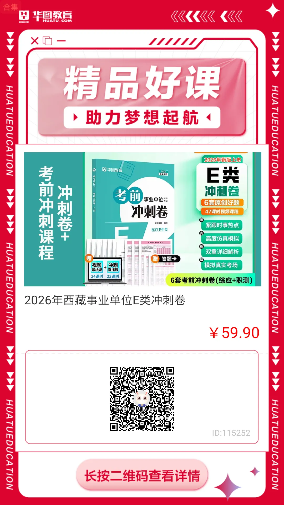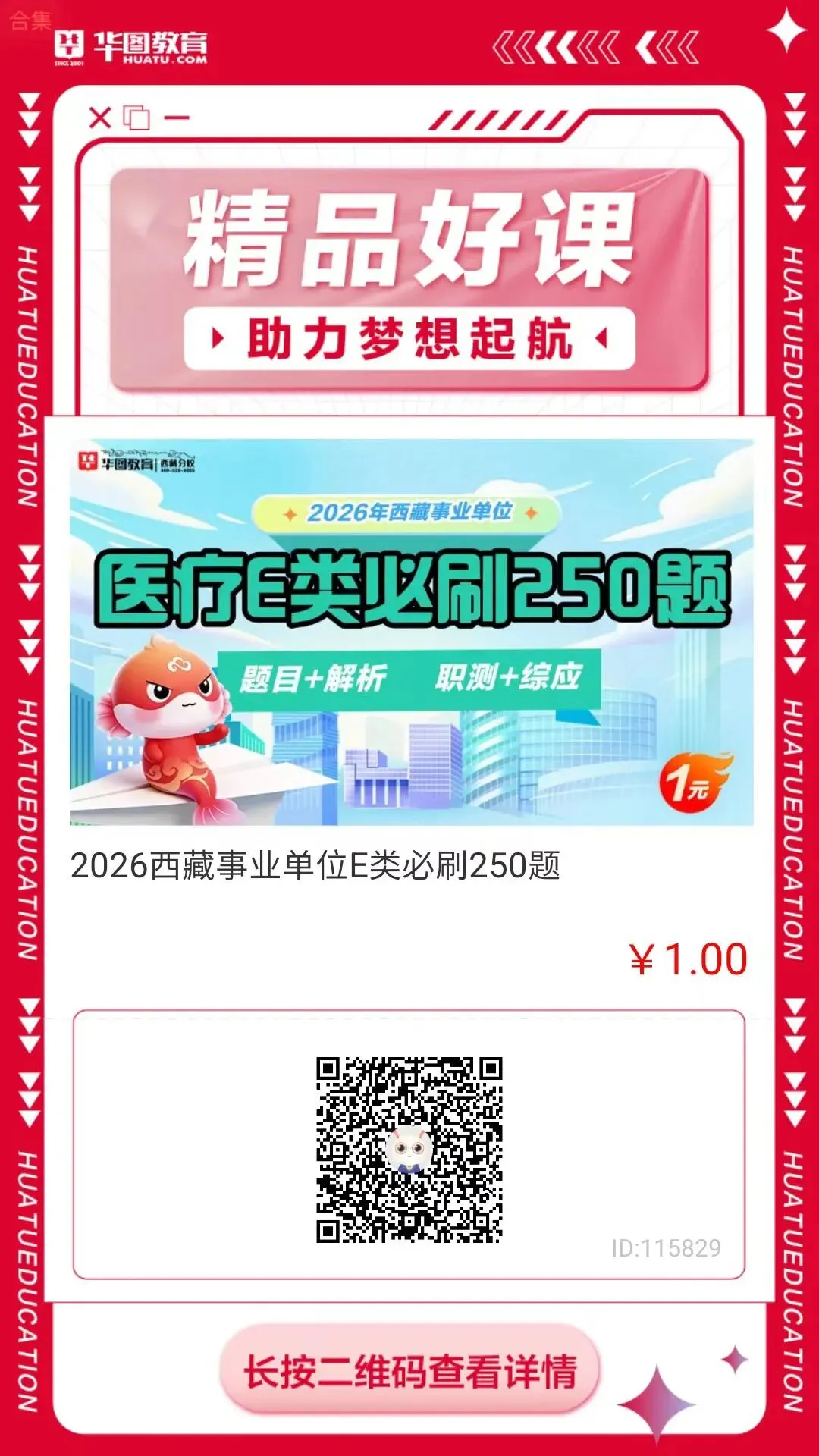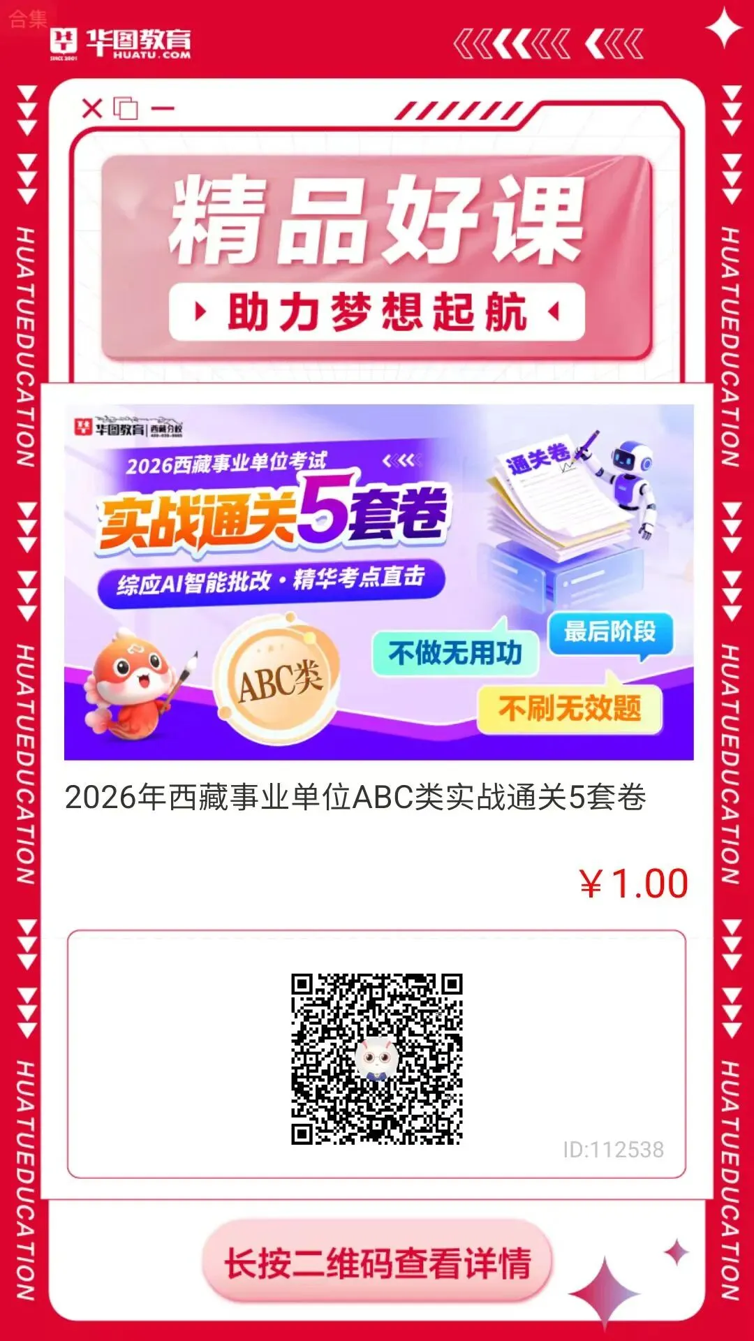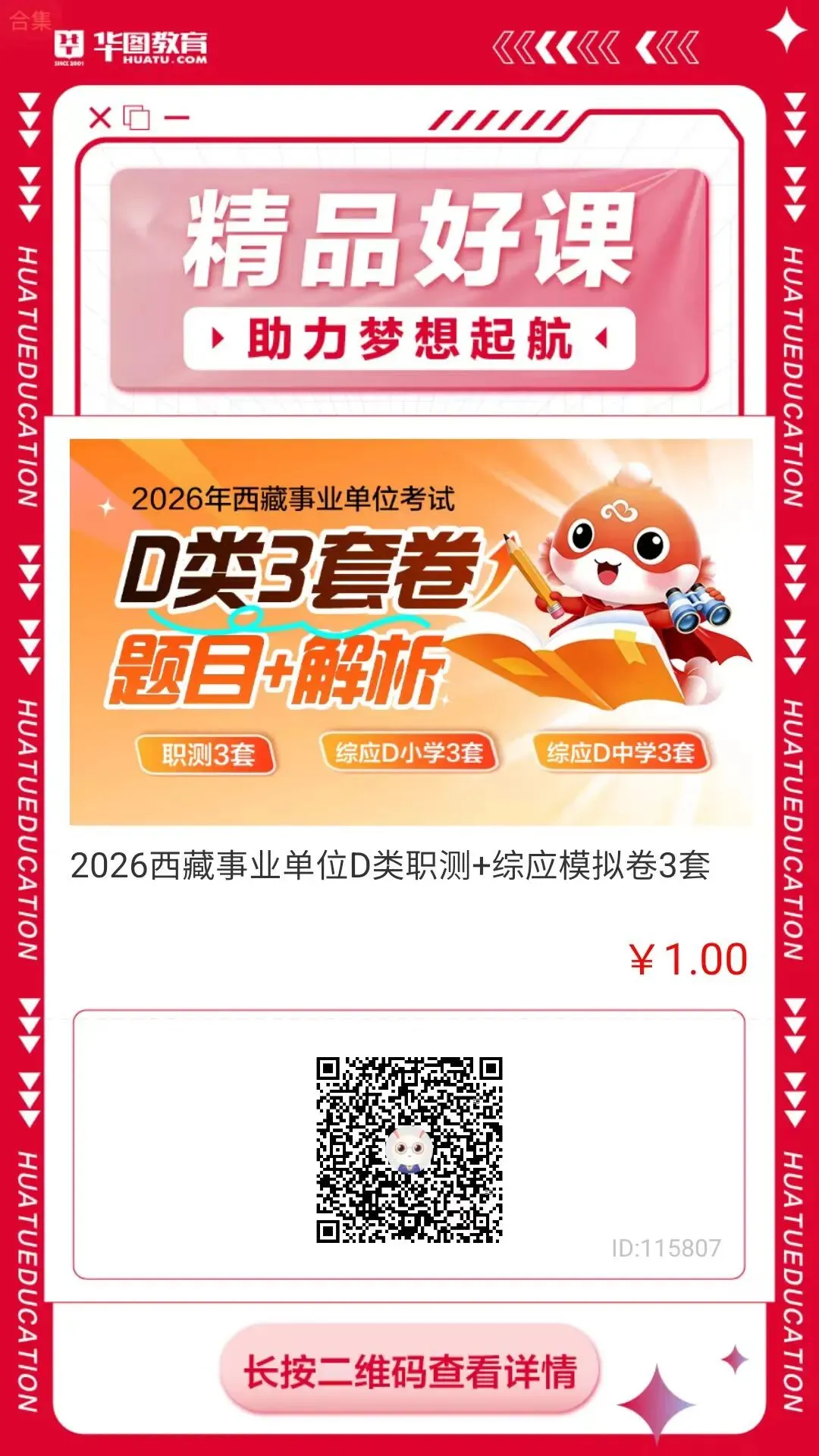 距离2026年西藏事业单位考试越来越近,备考时间紧、任务重,如何在有限的时间里高效提分?华图教育为你准备了三大类电子版备考资料,覆盖ABC类、D类(教师)、E类(医疗),职测+综应全包含,现在只需 1元 就能入手!