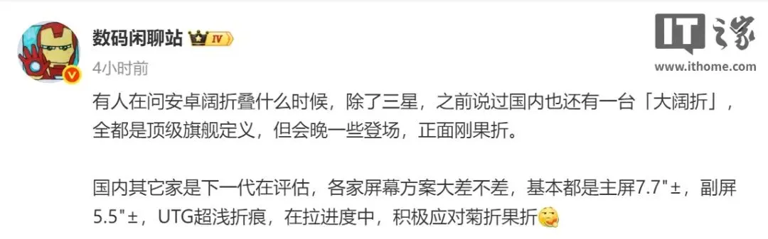 爆料博主发文剧透,除三星外,国内厂商也会有一台“大阔折”新机型,定位均是“顶级旗舰”,稍晚之后登场,正面应对苹果折叠屏手机。