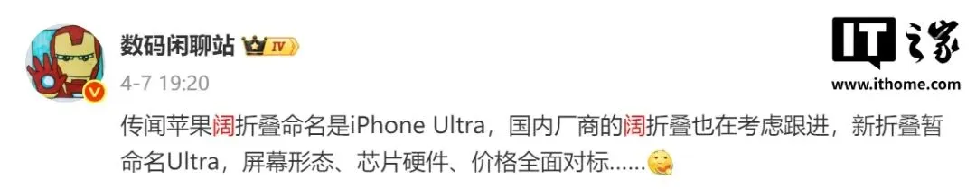 第三次则是 4 月,传闻苹果阔折叠命名是 iPhone Ultra,国内厂商的阔折叠也在考虑跟进,新折叠暂命名 Ultra,屏幕形态、芯片硬件、价格全面对标。