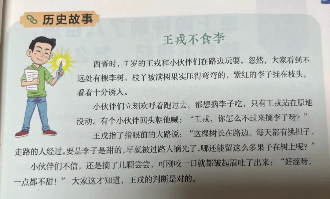 从这小情景中,让我想到“王戎不食李”的故事,当一群孩子看到路边的李子树结满果子,没有思考别的孩子一拥而上,直接去摘了就吃。只有王戎站在原地,靠独立思考判断出“树在道边而多子,此必苦李”。
