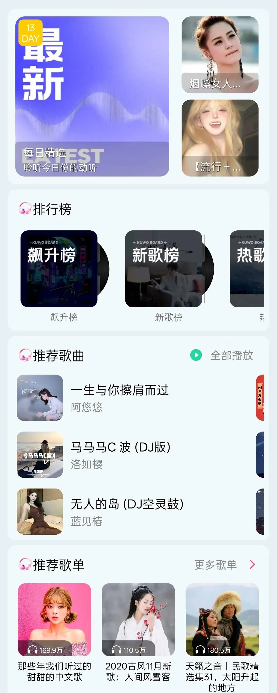 app的界面十分简单,首页最上面是歌单轮播,听众可以根据自己喜好试听,下面排行榜分别是不同的音乐类型,再下面就是歌曲和歌单的推荐,一直往下滑有很多不同类型的歌单。