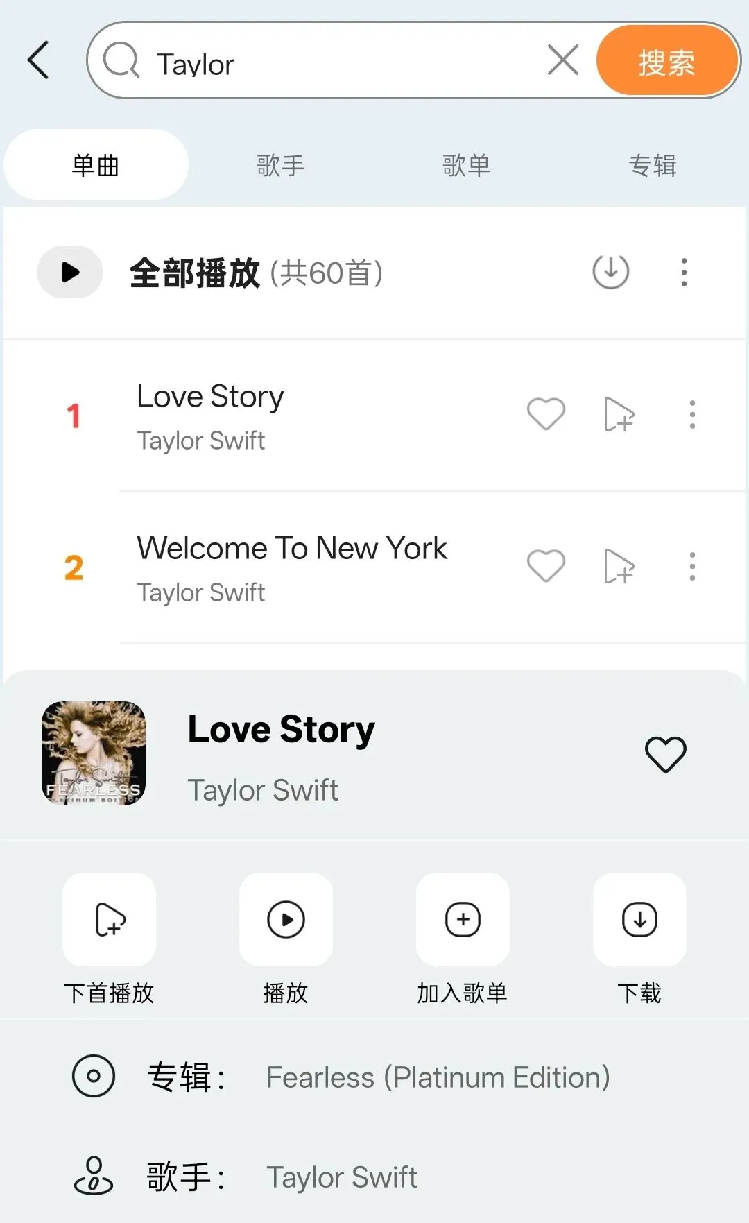 我随便搜索了一个歌手,点击歌曲后面的三个小点,在弹出的信息里面看到有一个下载按钮,直接点击下载就能将歌曲下载到本地,上面显示“共60首”不是代表只有60首歌,而是只加载了60首,继续下滑会加载更多的歌曲,一次多加载30首。根据歌曲占用存储判断,至少是320kbps以上的音质。