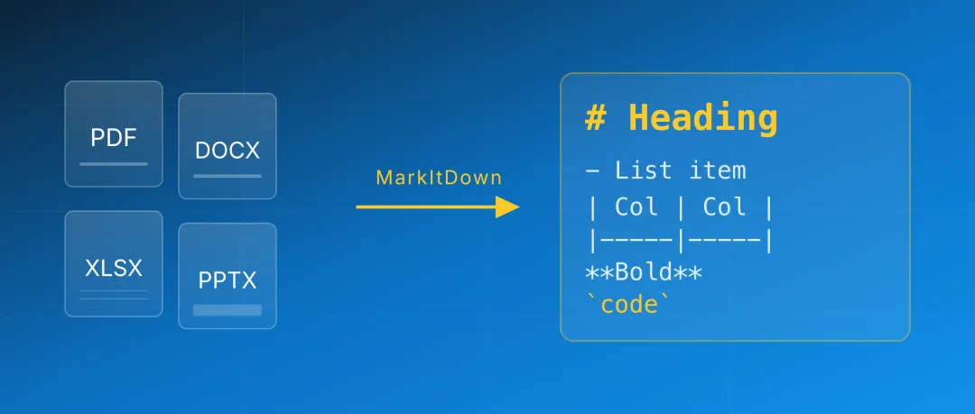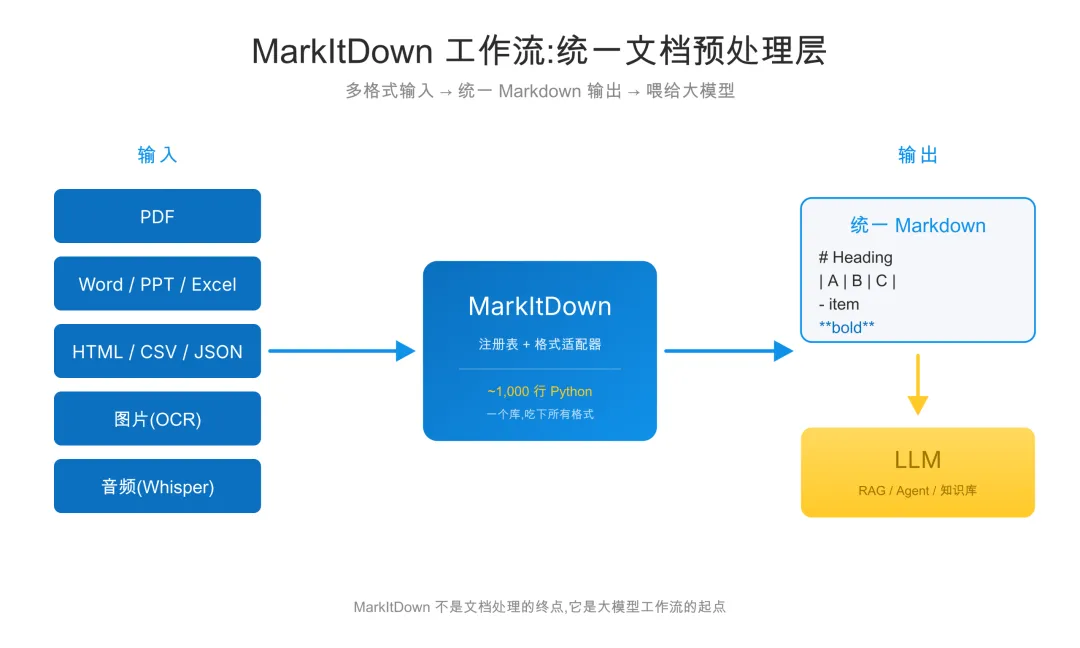▲ MarkItDown 将多种文档格式统一转为 Markdown 后输入 LLM