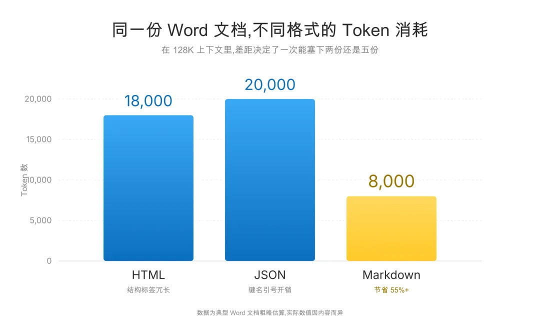 第三层是成本。同样一份 Word 文档,转成 HTML 或 JSON 往往会带入更多标签和字段;转成 Markdown 通常更克制。对上下文本来就紧张的长文场景,这种差别很实用。