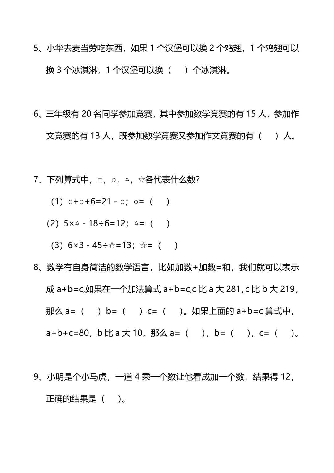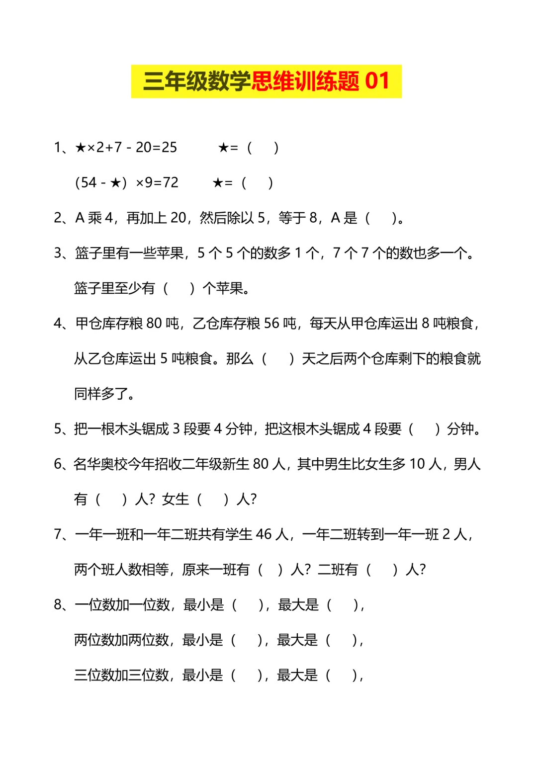 三年级(下)数学 思维训练题9套,PDF版,可打印,先保存后下载