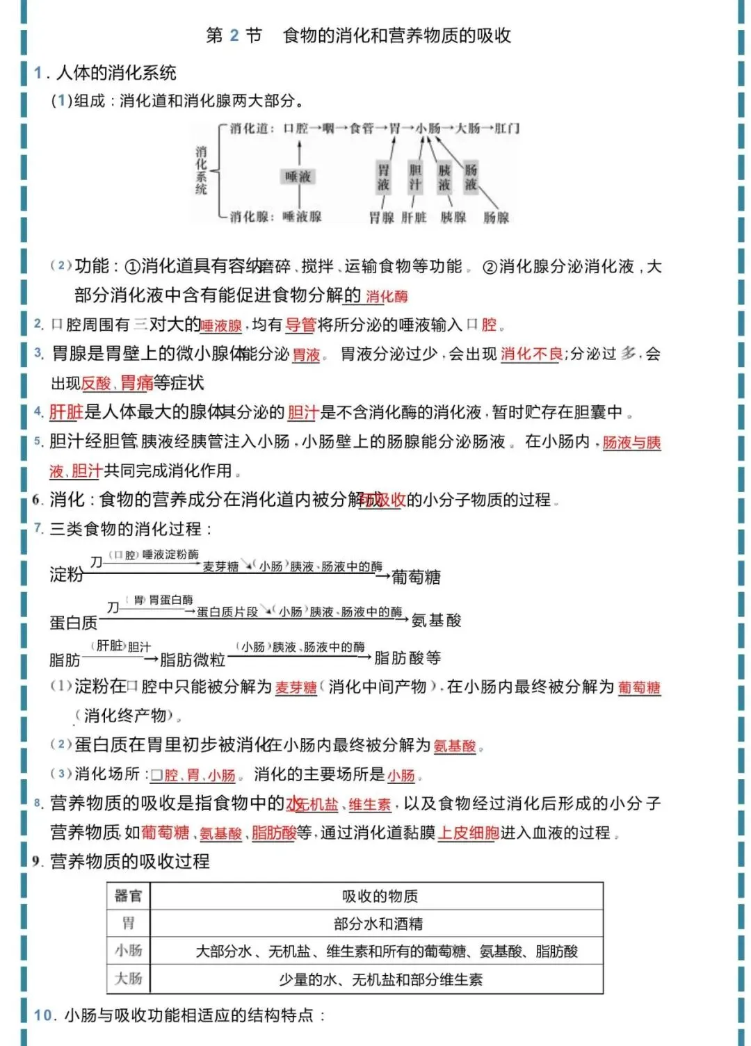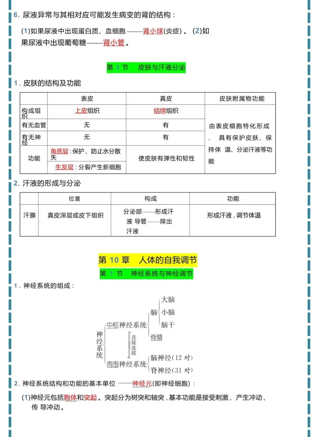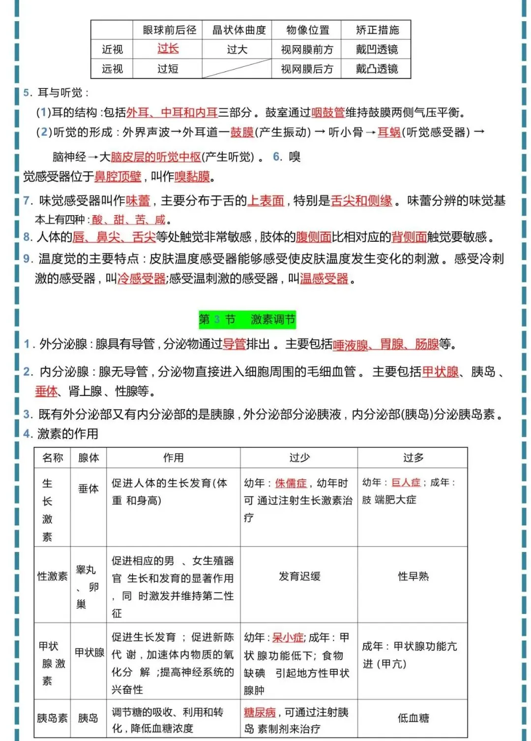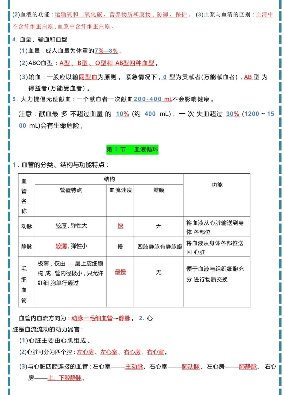 七年级下册生物(北师大版):全册考点总结,电子打印版!