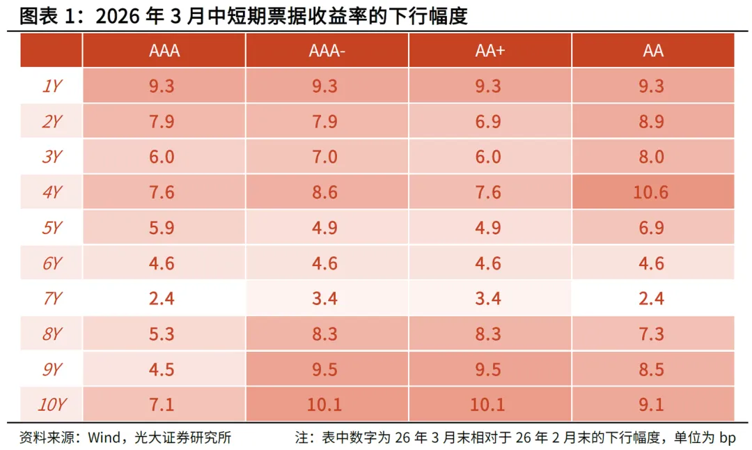 2026年3月,社融口径的企业债券净融资3945亿元,较去年同期多增4850亿元。促使企业债券净融资同比多增的因素很多,债券市场利率的平稳运行、稳中有降是其中之一。这段时间,货币政策加大了逆周期调节力度,主要债券品种的收益率皆有不同程度的下降。例如,今年3月末,1Y、3Y和5Y AAA级中短期票据的利率分别较今年2月末下行了9.3bp、6.0bp和5.9bp,上述期限的AA+级中短期票据利率分别下行了9.3bp、6.0bp和4.9bp。