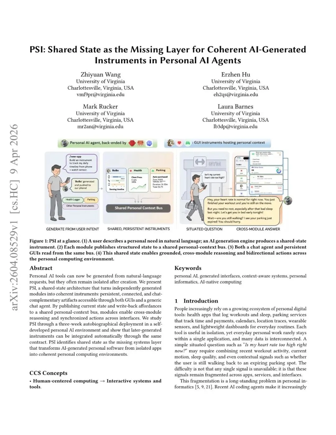 本研究聚焦于个人人工智能工具日益普及但彼此孤立的核心问题。随着AI编码代理的发展,用户能够通过自然语言请求生成个性化的数字工具(如健康追踪、停车计时等应用)。然而,这些工具在生成后往往成为信息孤岛,无法相互协作,导致用户在处理跨应用场景(如结合心率、运动量和停车状态判断身体状况)时面临数据碎片化的挑战。这种碎片化问题长期存在于个人信息学领域,限制了个人计算环境的整体效能。PSI提出了一种共享状态架构来解决这一集成难题。该架构的核心是引入一个共享的个人上下文总线(personal-context bus),作为连接独立生成模块的系统层。每个模块(即一个完整软件包,包括其GUI、数据提供者和可选服务)被设计为一个‘工具’:具备持久性(无需重复生成即可可用)、连接性(向共享总线发布状态并可暴露回写功能)以及对聊天的互补性(支持可视监控,而聊天处理综合、模糊解析和状态操作)。主要技术方法包括定义统一的集成合约,使得模块能将当前状态和回写功能发布到总线上。一个通用的聊天代理(Facai)和持久化的图形界面都基于同一总线进行读写操作,从而实现跨模块推理和跨接口同步行动。核心创新点在于首次将共享状态识别为关键的系统层,将AI生成的个人软件从孤立应用转变为连贯的计算环境。该方法并非创造新的代码生成代理,而是提供了一个最小化的运行时合约,使独立生成的模块能够在创建后相互识别并协同工作。实验通过一个为期三周的自传式部署在名为RyanHub的自研个人AI环境中进行验证。结果表明,与仅基于搜索或单模块的基线相比,PSI显著增强了跨模块推理能力,并在持久化工具间保持了可靠的回写功能。新生成的模块可以通过相同的合约和注册路径自动集成到PSI生态中,证明了其可扩展性。性能上,共享状态架构实现了跨模块的 grounding reasoning 和双向操作。研究意义在于为AI原生计算提供了关键的集成框架,解决了生成后协作的空白。应用前景广阔,可推动个人AI工具从数量增长转向质量协同,为构建真正连贯、情境感知的个人数字环境奠定了理论基础和实践路径。论文承诺在接受后开源PSI系统、RyanHub iOS应用及代表性模块。