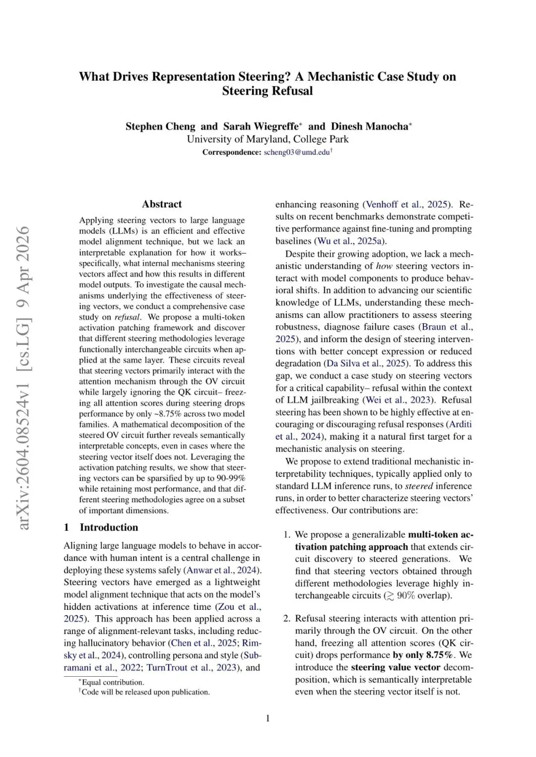 本研究聚焦于大语言模型对齐技术中的表征导向方法,旨在揭示导向向量如何通过与模型内部机制交互来改变模型行为。尽管导向向量作为一种轻量级对齐技术已在减少幻觉、控制风格和增强推理等任务中展现出高效性,但其作用机制尚缺乏可解释的理解。为此,论文以拒绝行为为案例,开展了深入的机理分析。研究团队提出了一种多令牌激活修补框架,将传统的电路发现方法扩展到导向生成场景,以识别导向向量影响的关键模型组件。核心创新点包括发现不同导向方法在相同层激活时利用功能可互换的电路;通过数学分解揭示了导向向量主要通过注意力机制中的OV电路发挥作用,而QK电路的影响较小(冻结注意力分数仅导致性能下降约8.75%);进一步提出了导向值向量分解方法,使得即使在导向向量本身不可解释的情况下也能获得语义可解释的概念。实验结果表明,基于机理分析结果,拒绝导向向量可稀疏化高达90%而仍保持大部分性能,且不同导向方法在重要维度上存在共识。这些发现不仅增进了对LLM内部运作机制的科学理解,还为评估导向鲁棒性、诊断故障案例以及设计更优导向干预措施提供了实践指导,具有重要的理论价值和实际应用前景。