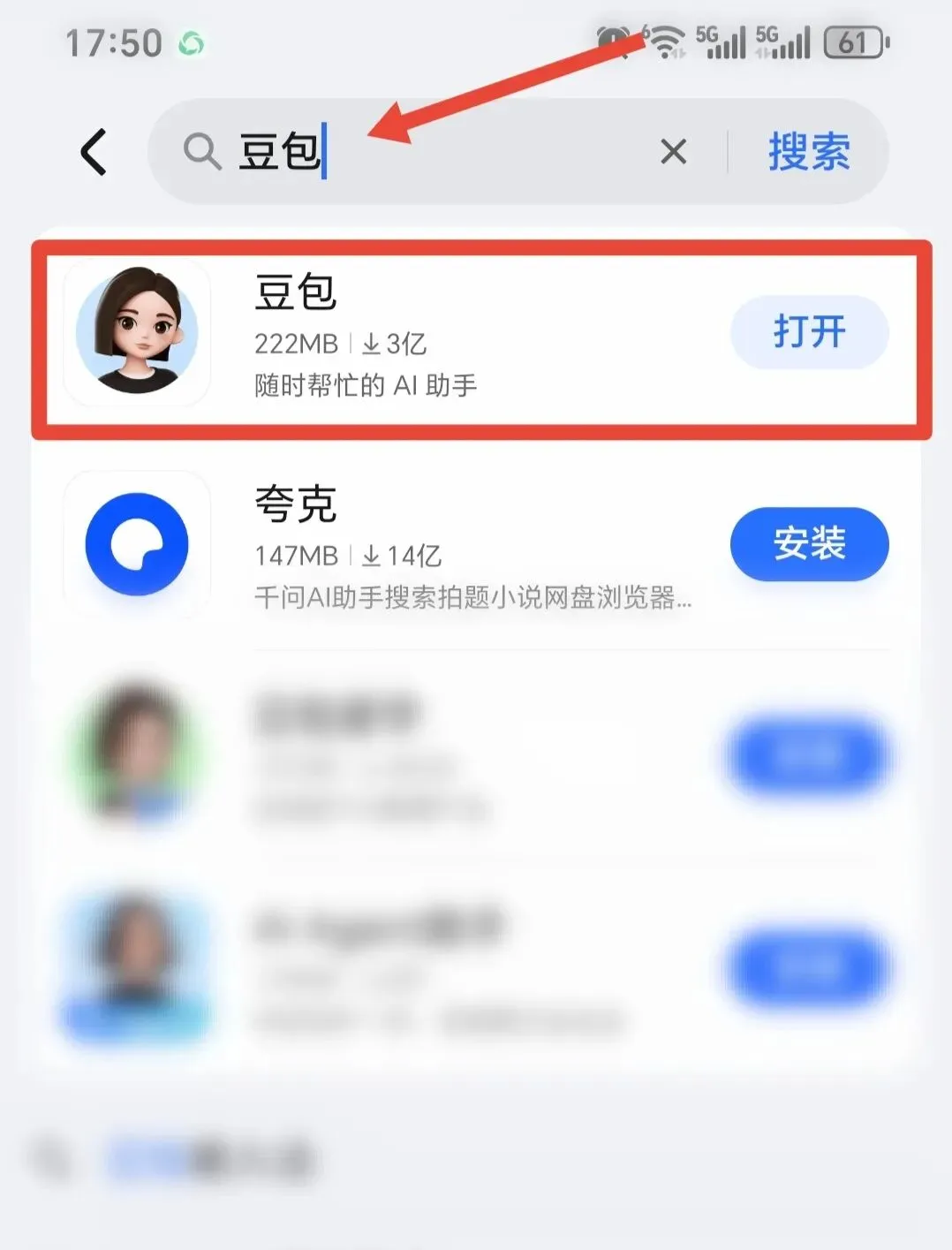 3. 在搜索结果里,找到刚才说的官方图标的豆包,点击右边的安装按钮;