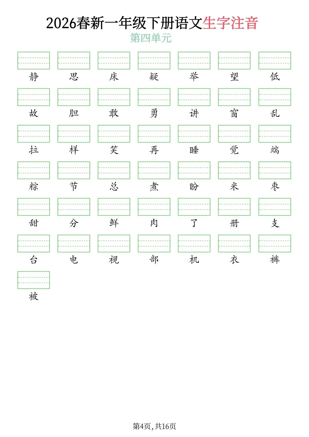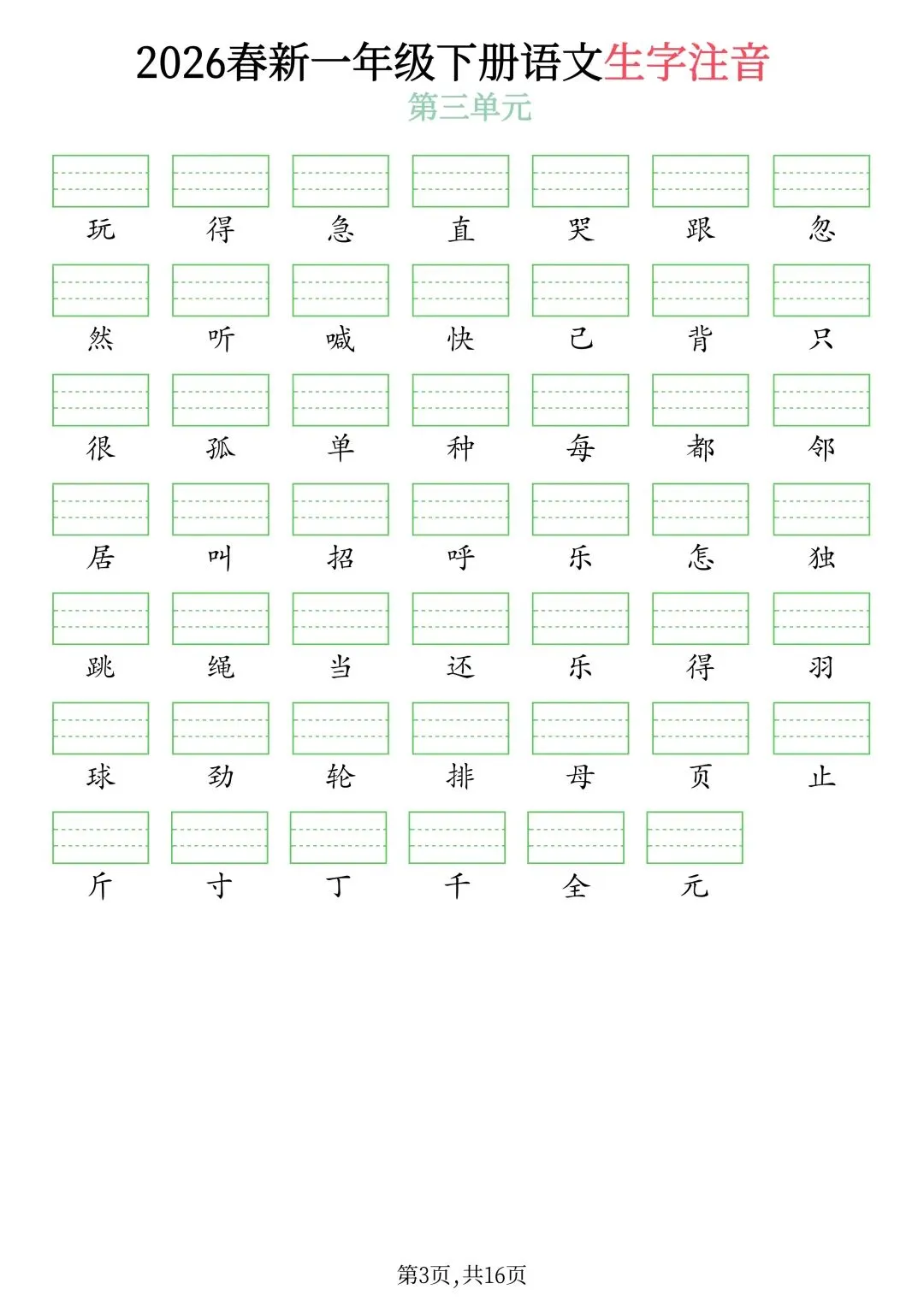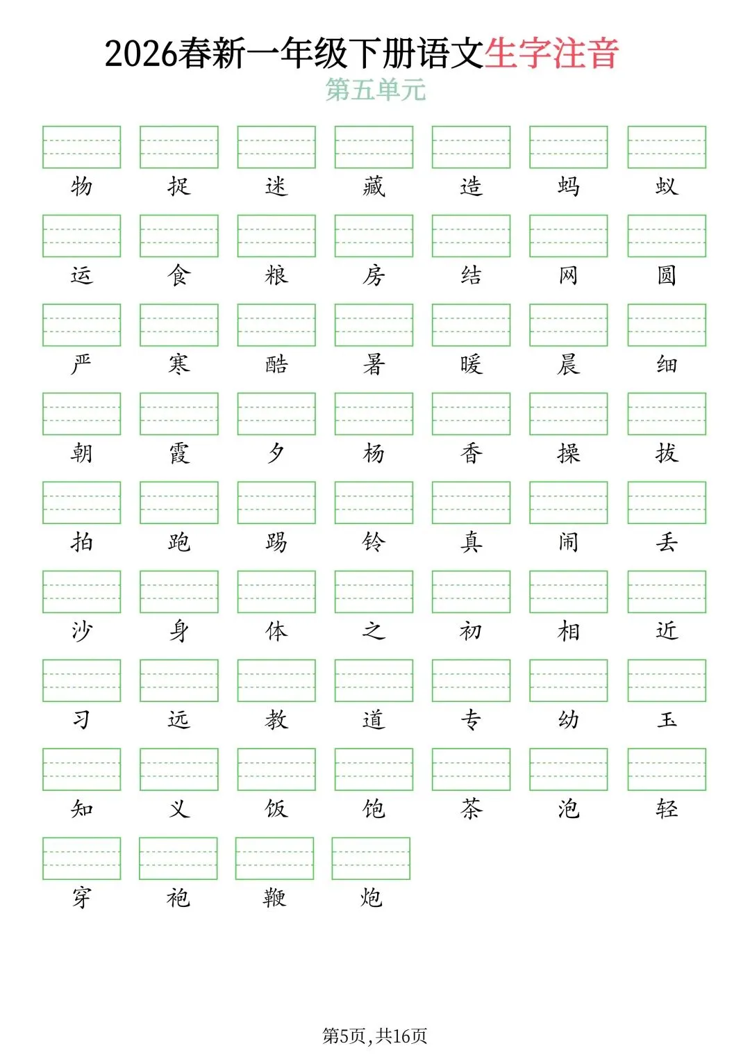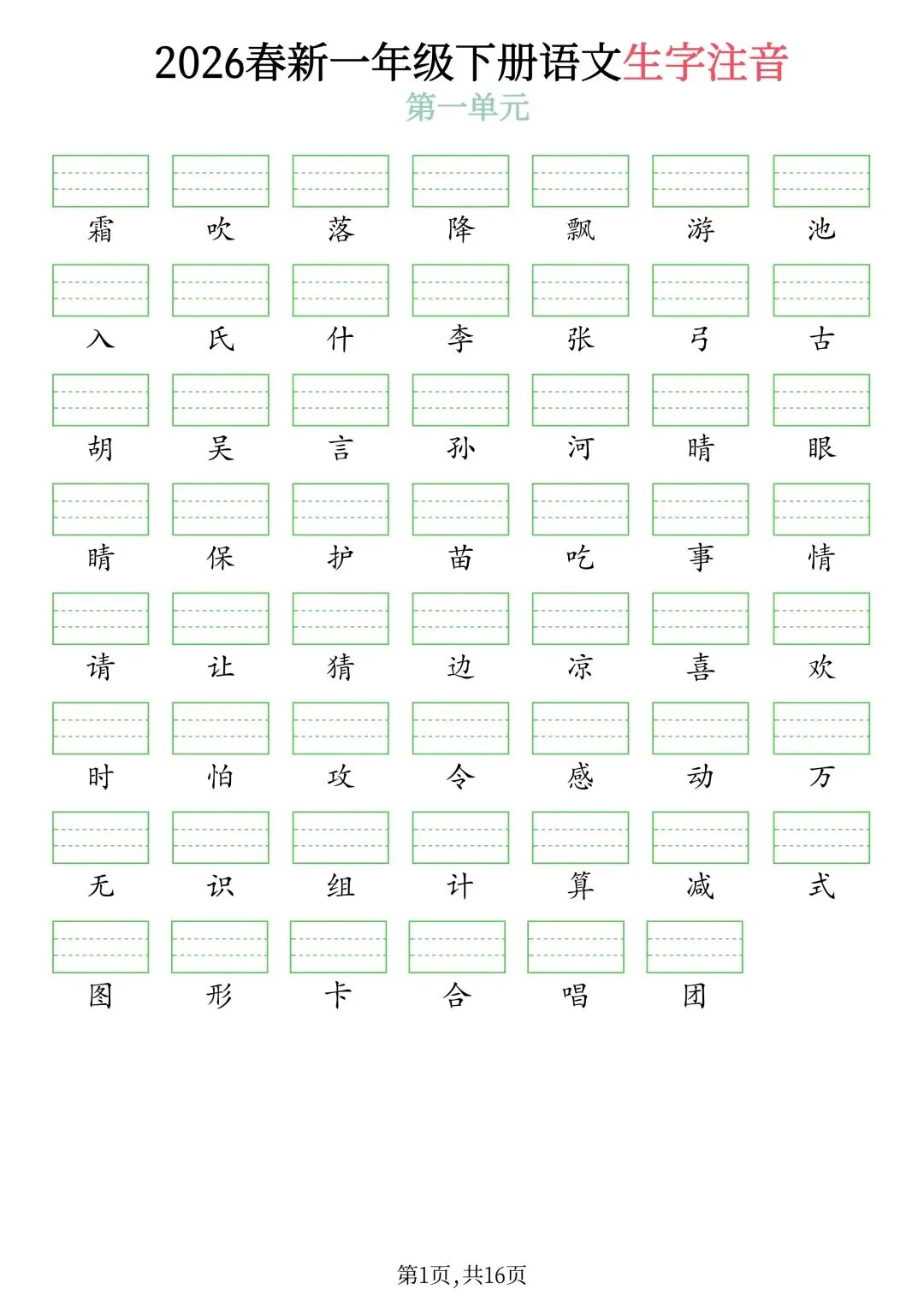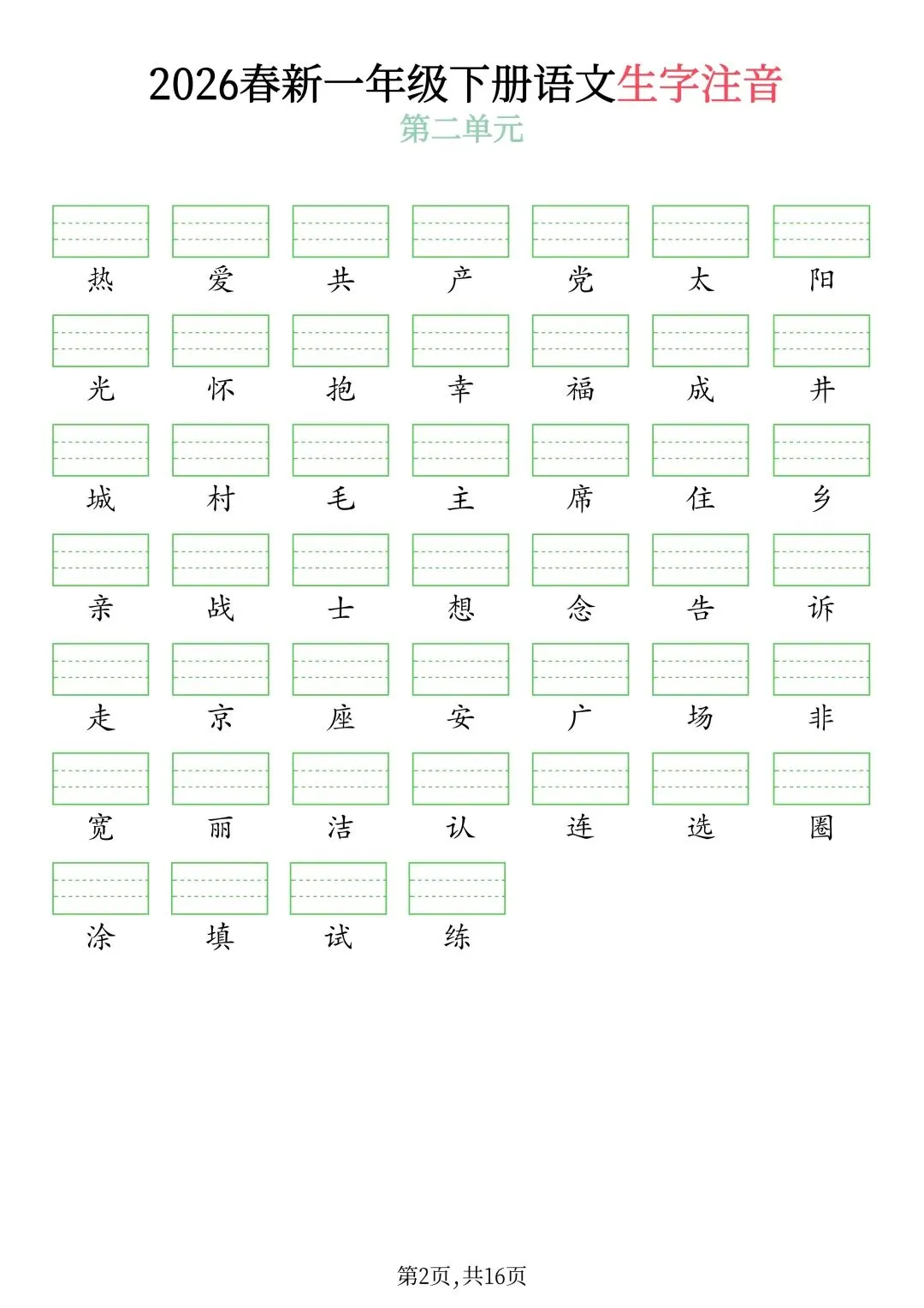 各位一年级家长好!新学期语文学习,生字认读是基础中的基础。这份2026春新版一年级下册语文第二单元生字注音,帮孩子精准掌握每一个生字的读音,日常预习、复习、听写都能用,建议家长收藏打印,给孩子反复练习~