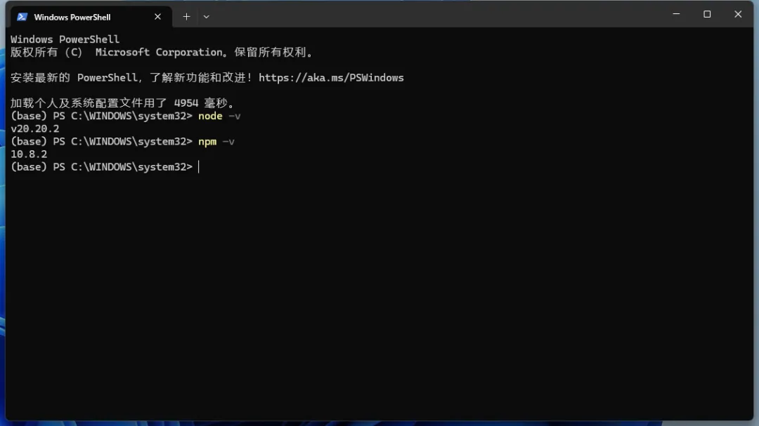 安装后打开一个PowerShell输入 node -v 和 npm -v,如果有版本号说明成功。