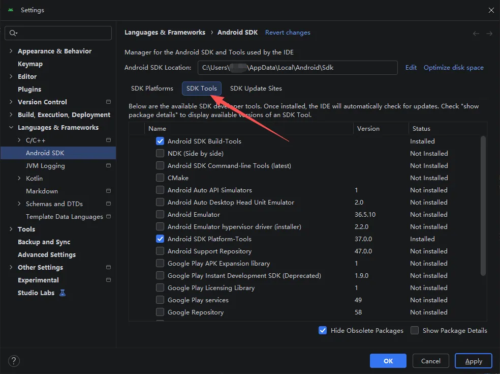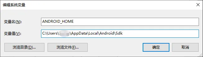 新建系统变量 ANDROID_HOME,值为 SDK 路径(例如 C:\Users\你的用户名\AppData\Local\Android\Sdk)。