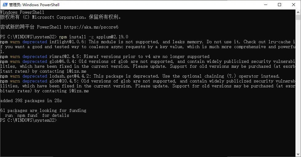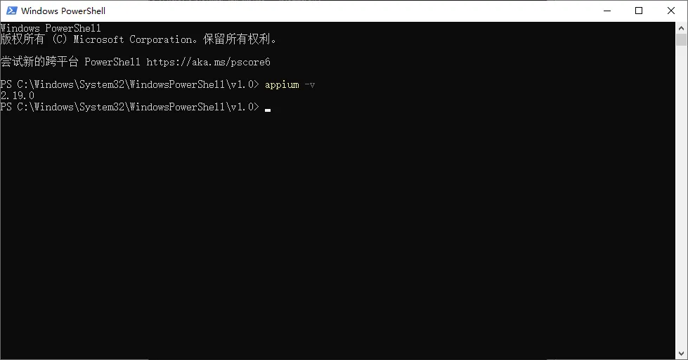 重新打开一个PowerShell(建议右键“以管理员身份运行”),输入 npm install -g appium@2.19.0