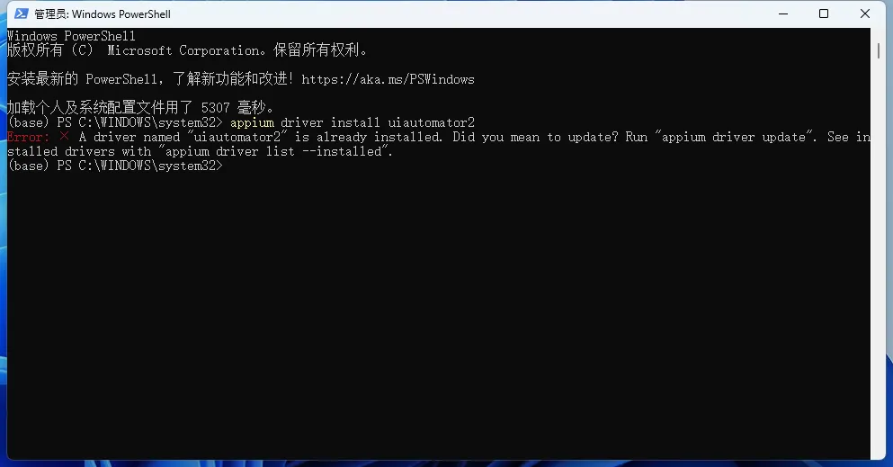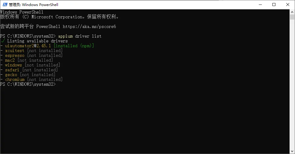 重新打开一个PowerShell 输入 appium driver install uiautomator2@2