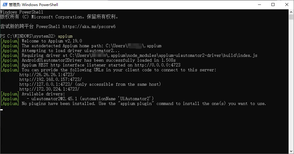启动 Appium Server,重新打开一个PowerShell,输入 appium 并回车。注意:这个窗口不要关!