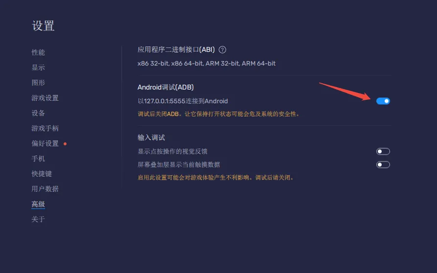 关键步骤:在模拟器设置中开启Android调试(ADB)