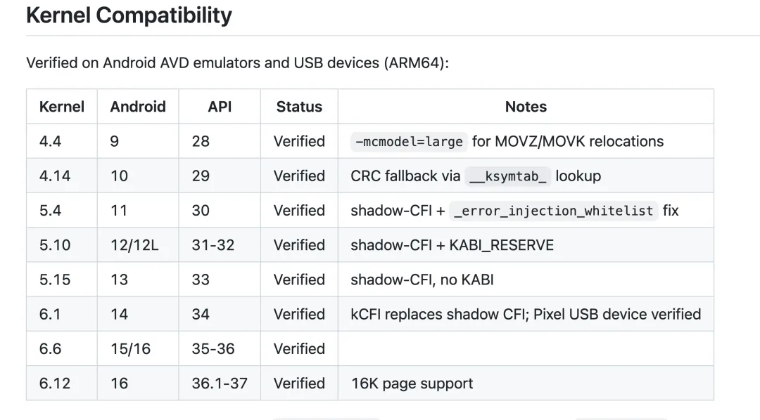 安卓16设备使用16K页内核。KernelHook在 kh_pgtable_init中通过TCR_EL1.TG1动态检测页大小,所有页表操作基于运行时值而非编译时常量,天然兼容4K和16K。