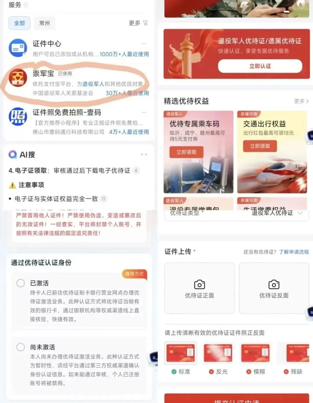 支付宝搜“退役军人电子优待证”;点开崇军宝;开始认证个人信息;实名后申领,确认信息;