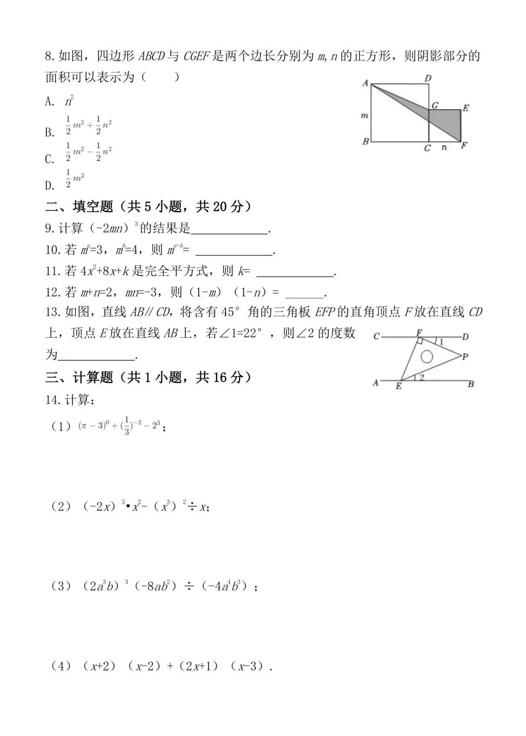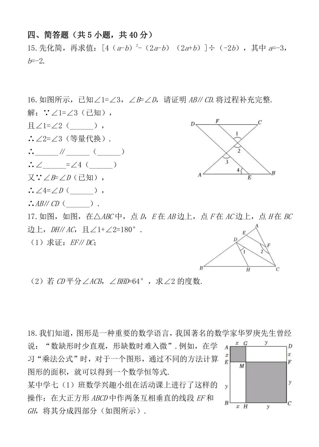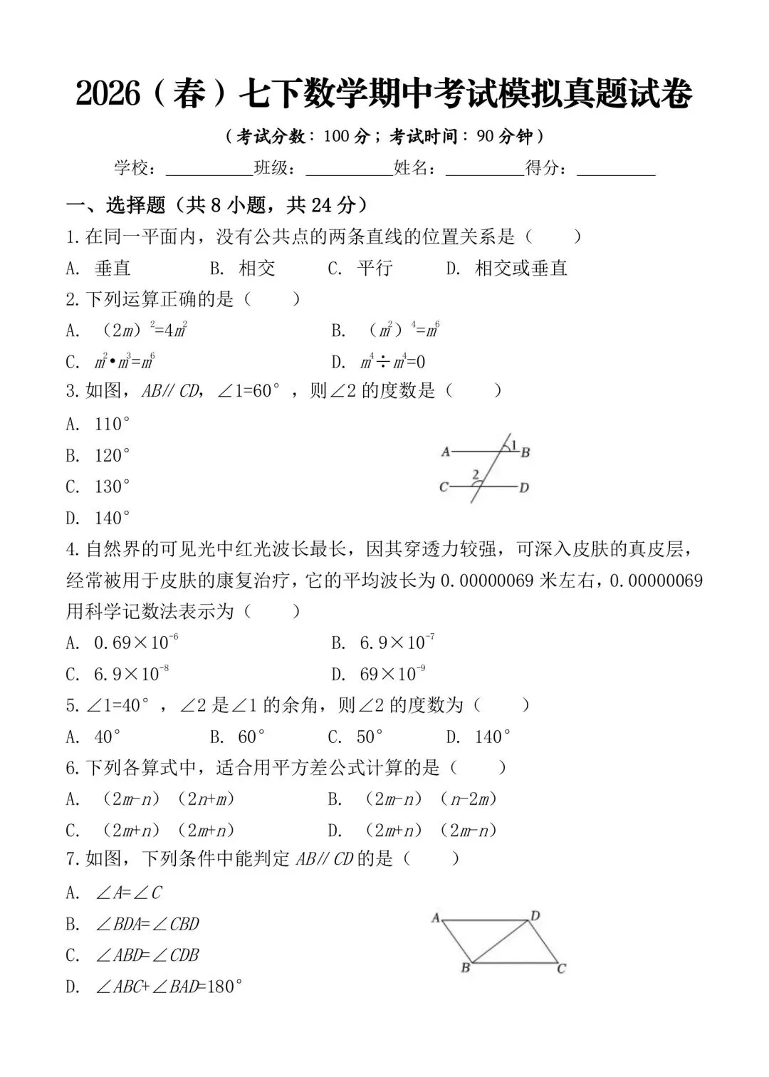 七年级下册数学期中考试模拟卷含答案可打印