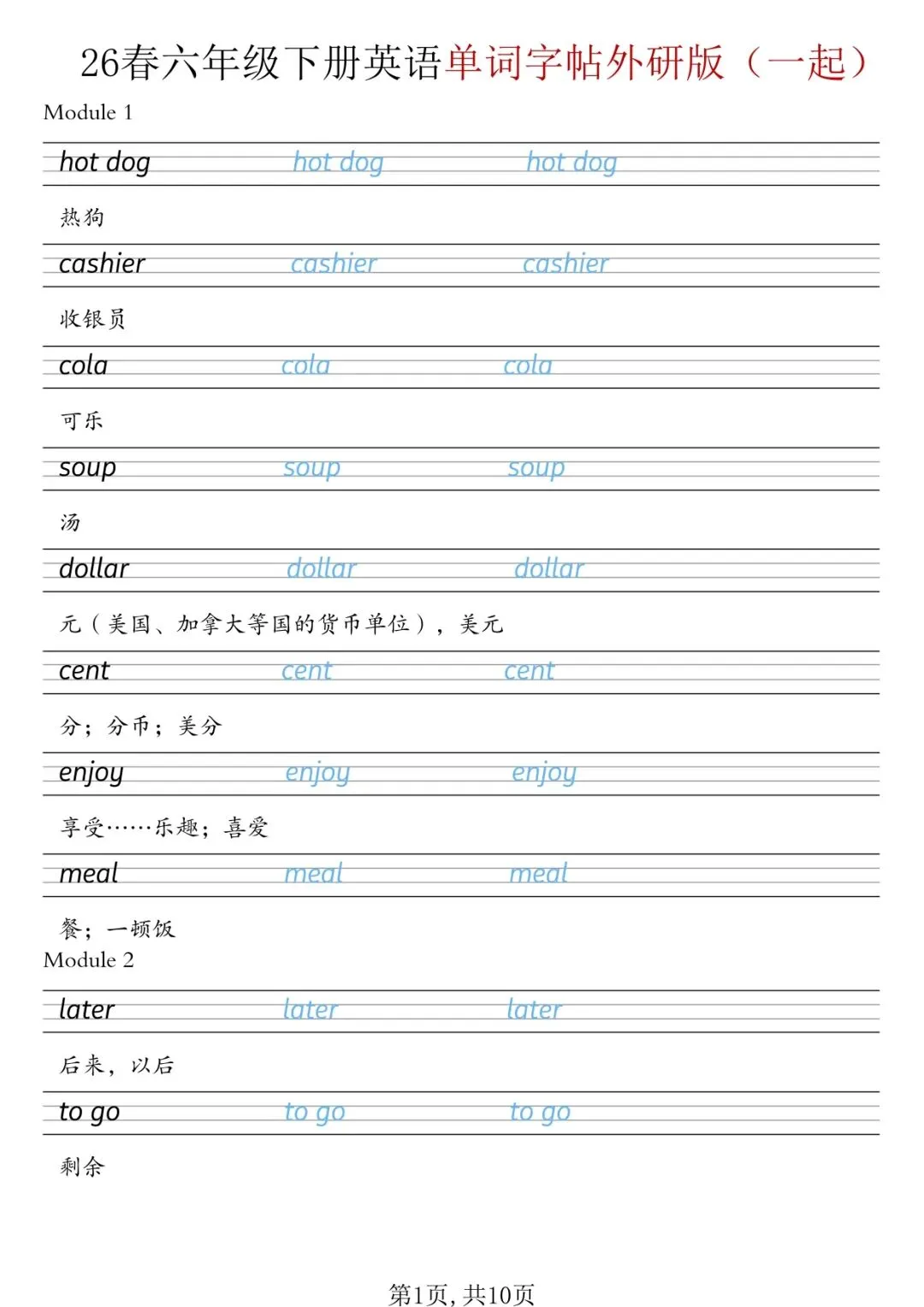 可下载丨六年级下册英语26春单词字帖《外研版(一起)》,电子版
