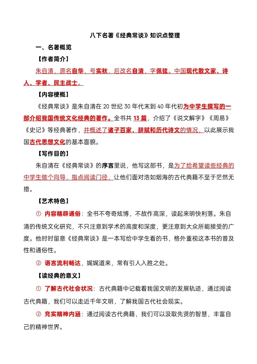 八下语文名著阅读《经典常谈》知识点整理,可免费领取打印