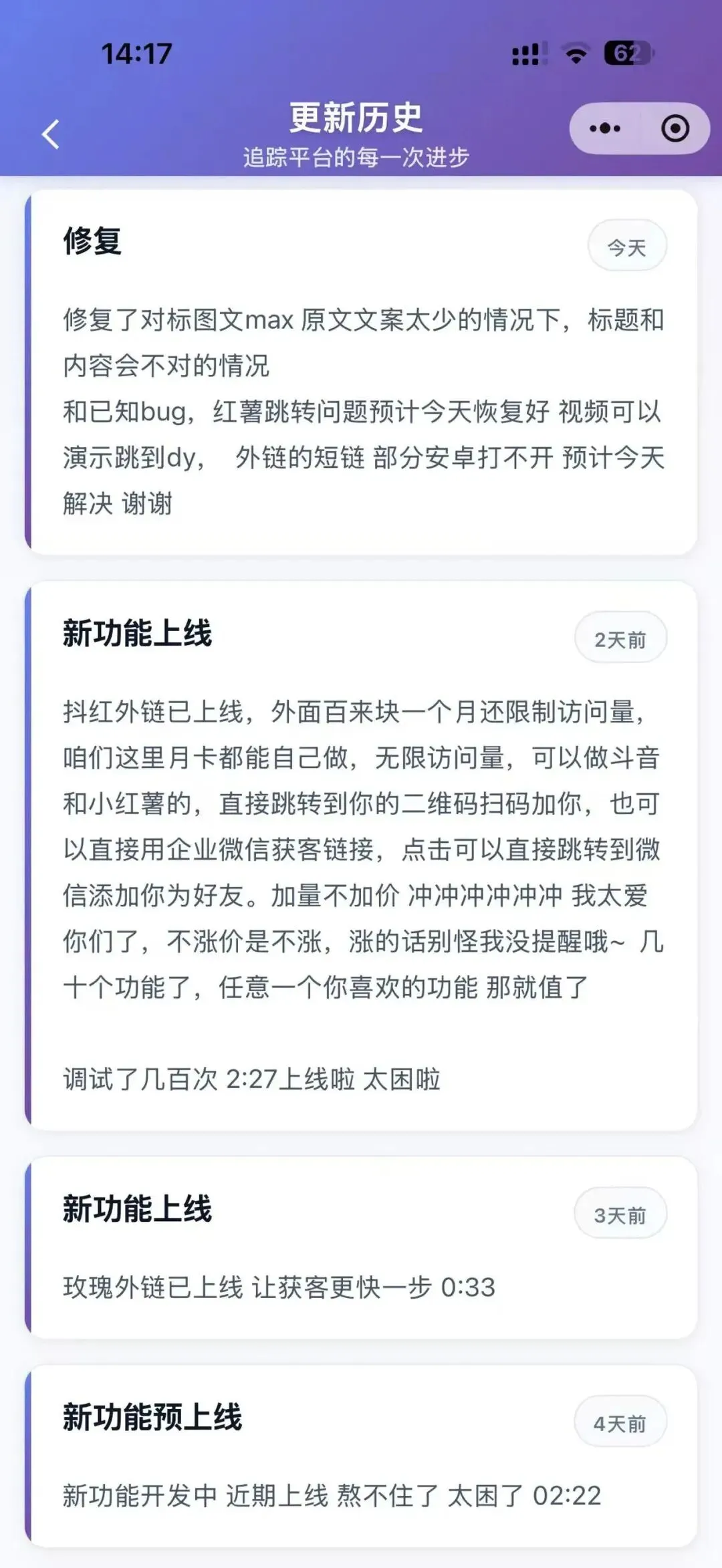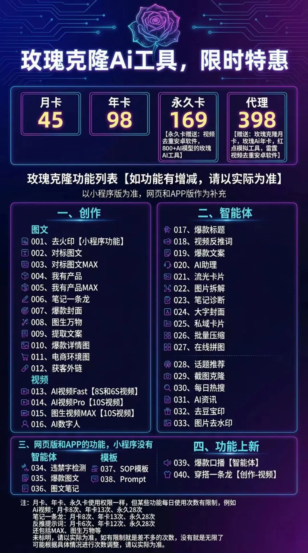 近期我们全新上线了抖红外链功能,单看这一项功能,在市面上单独购买,每月花费一百多元都是常态。而玫瑰克隆整合了全部优质功能,涵盖大家日常所需的各类AI应用,全套功能包月仅需45元,花更少的钱,享受远超单一功能的全方位服务,性价比一目了然。