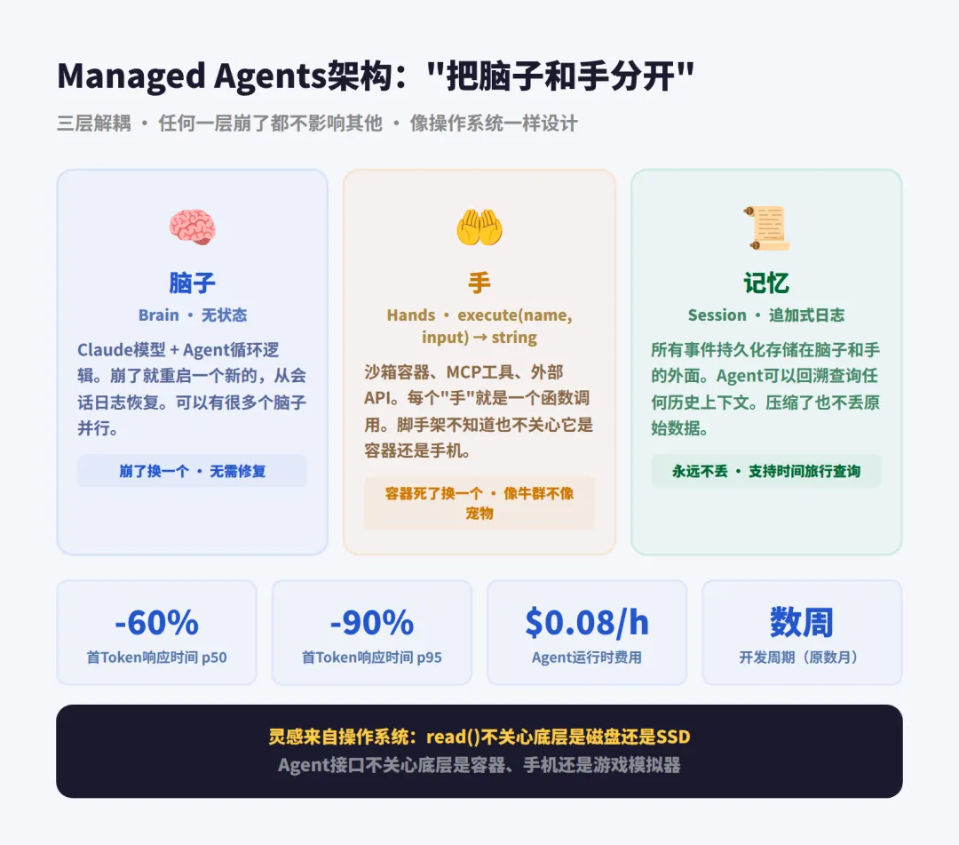 所以Managed Agents被设计成”元脚手架”——不绑定任何特定实现,只提供通用接口。 灵感来自操作系统的设计:read()命令不关心底层是1970年代的磁盘还是现代SSD。