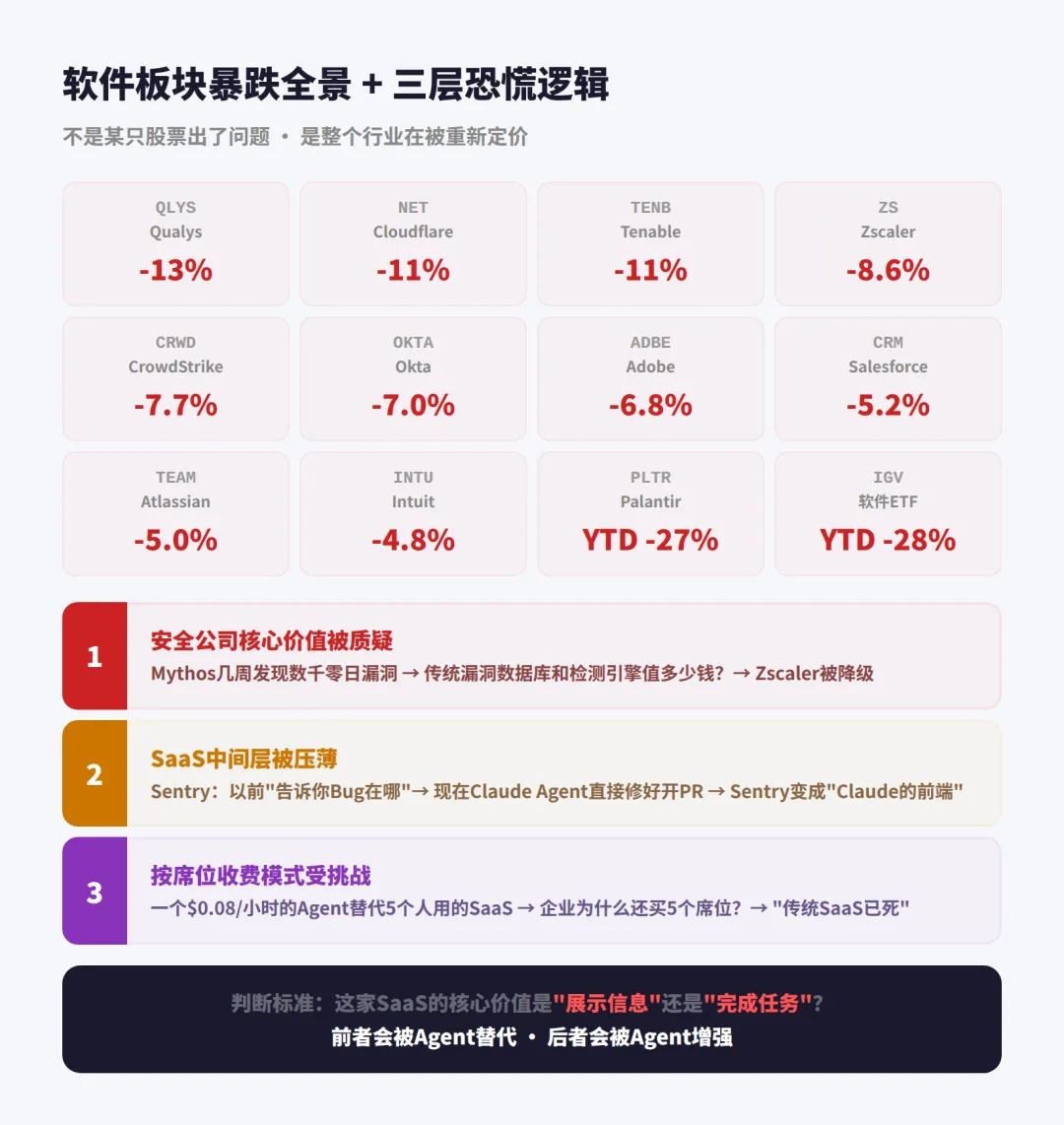 表面原因是Mythos的网络安全能力吓坏了市场——一个AI能发现所有主流系统的零日漏洞,传统安全公司还有什么价值?