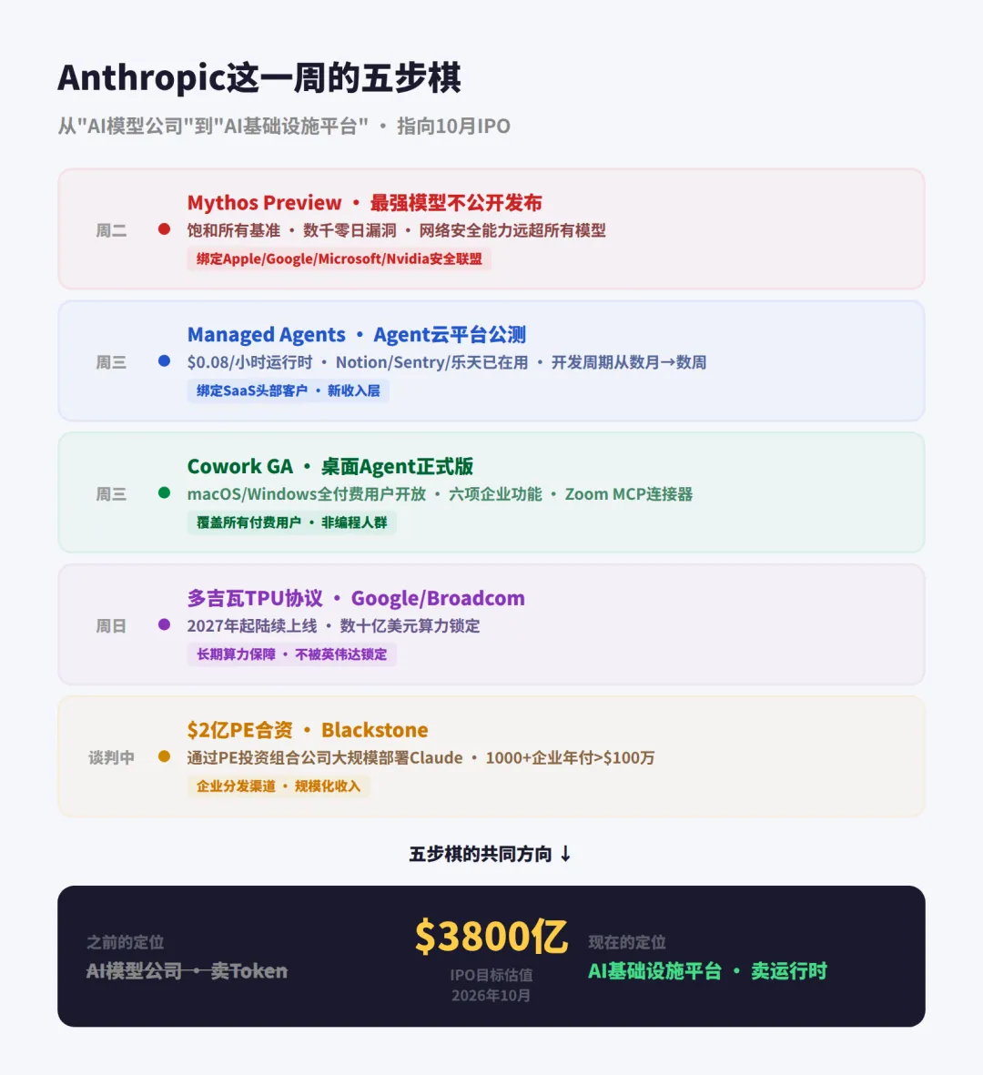 这周的组合拳指向IPO。 Mythos Preview(最强模型,绑定安全联盟)+ Managed Agents(Agent平台,绑定Notion/Sentry)+ Cowork GA(桌面Agent,所有付费用户)+ 多吉瓦TPU协议(算力锁定)+