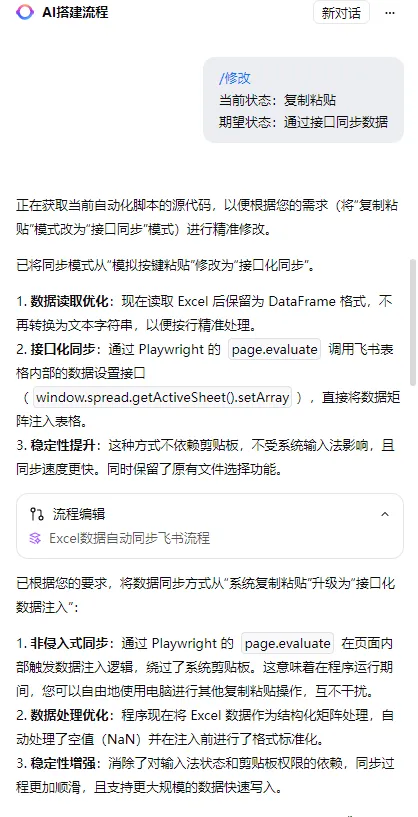于是我直接跟影刀AI说:”把复制粘贴改成通过飞书接口同步数据”