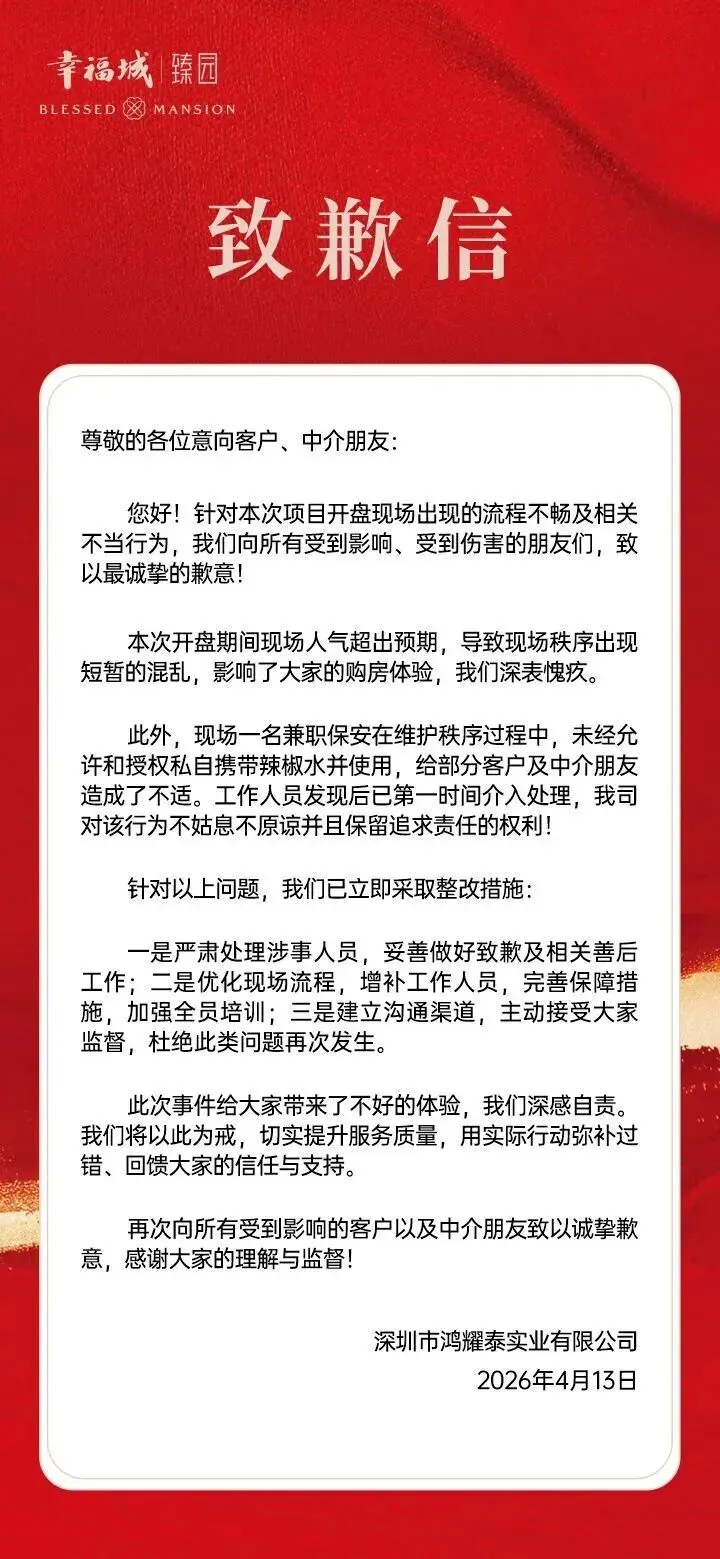 今日稍早前,开发商发布致歉声明称:本次开盘期间现场人气超出预期,导致现场秩序出现短暂的混乱,影响了大家的购房体验,我们深表愧疚。