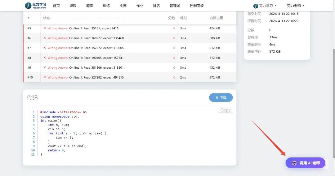 在代码提交界面,AI会自动识别提交的题面和提交的代码,也是直接问问题即可!