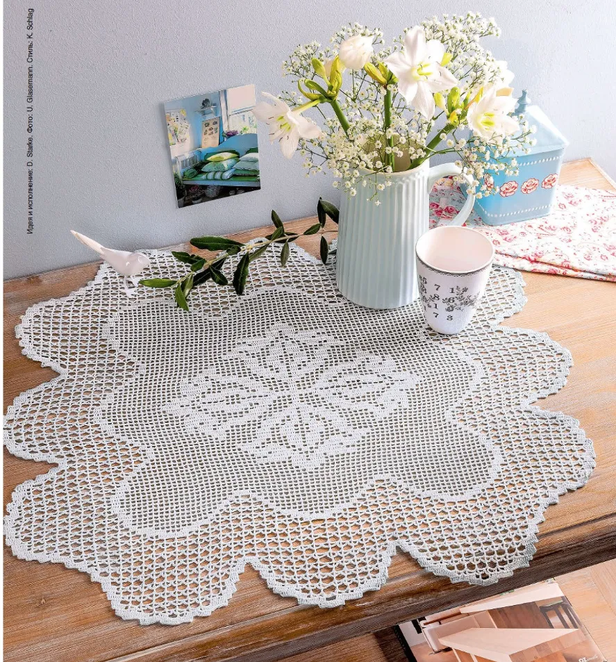 尺寸: 60 × 57 cm材料: 钩针编织蕾丝线(100% 棉;140 m/25 g)—— 110 g 白色;1.25–1.5 号钩针;喷雾式定型剂。