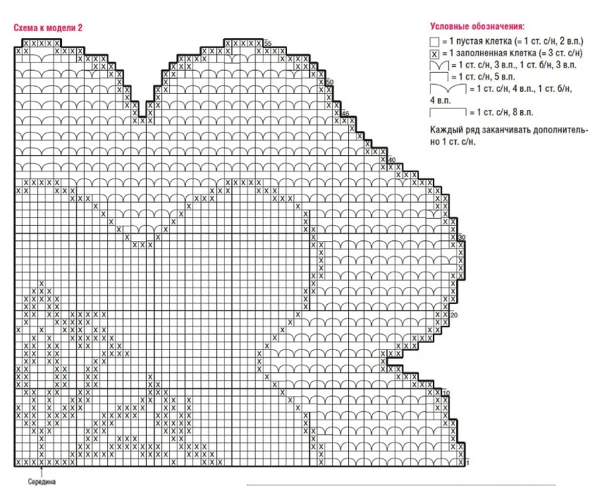 图解中的箭头表示中心位置,后半部分的每一行对称完成。从第 1 行钩至第 55 行,其中从第 46 行开始,每个扇形花边分别完成。为此,每次用 1 针引拔针固定线头。然后将织物旋转 180 度,在起始锁针链上钩织第 2 至第 55 行(每个扇形花边分别完成)= 共 109 行。