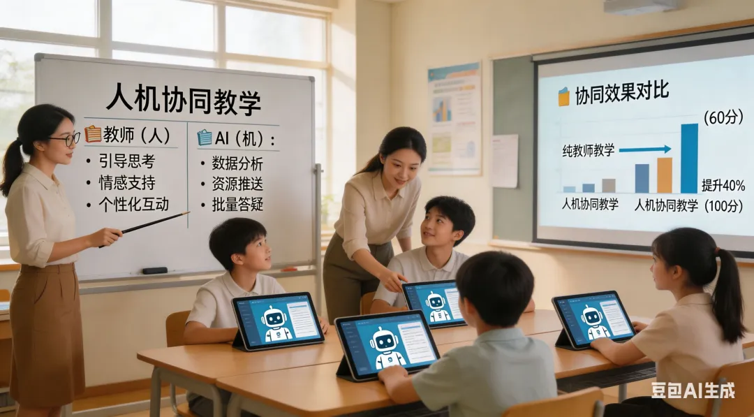 这个问题,五部门文件已经给出了明确的答案:探索人机协同教学模式。也就是说,AI 永远是老师的助手,不是老师的替代者。