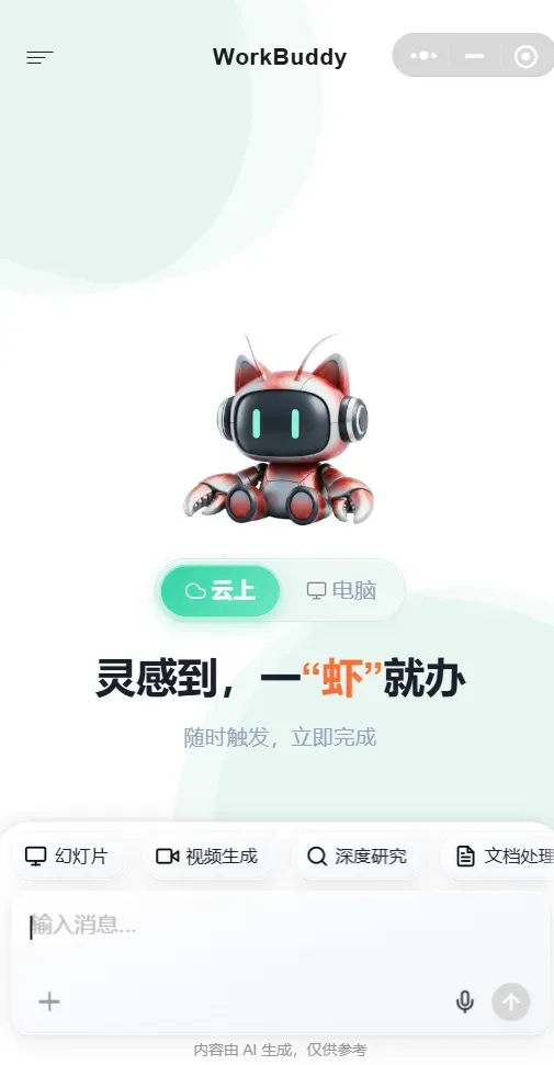 WorkBuddy微信小程序正式上线,支持”云端+本机”双模式运行。