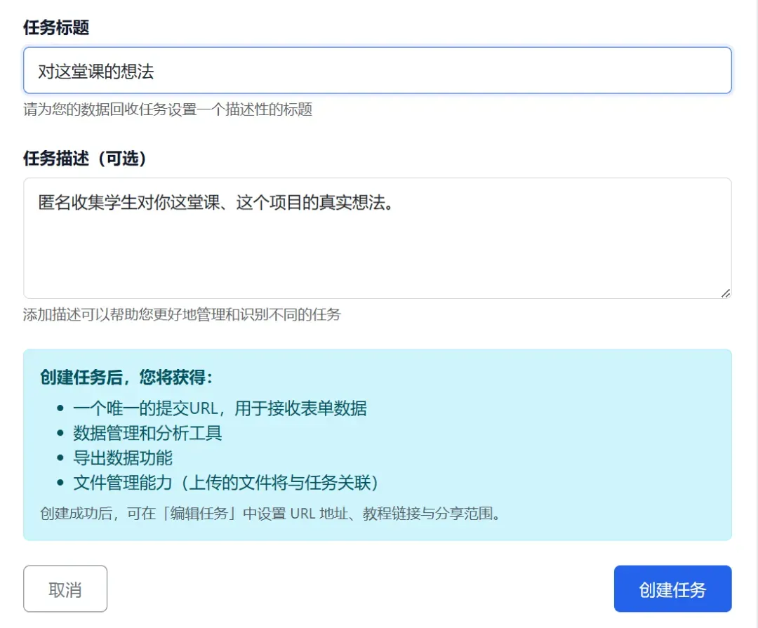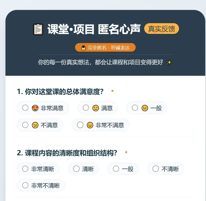 5、教学评价与反馈:匿名收集学生对你这堂课、这个项目的真实想法。