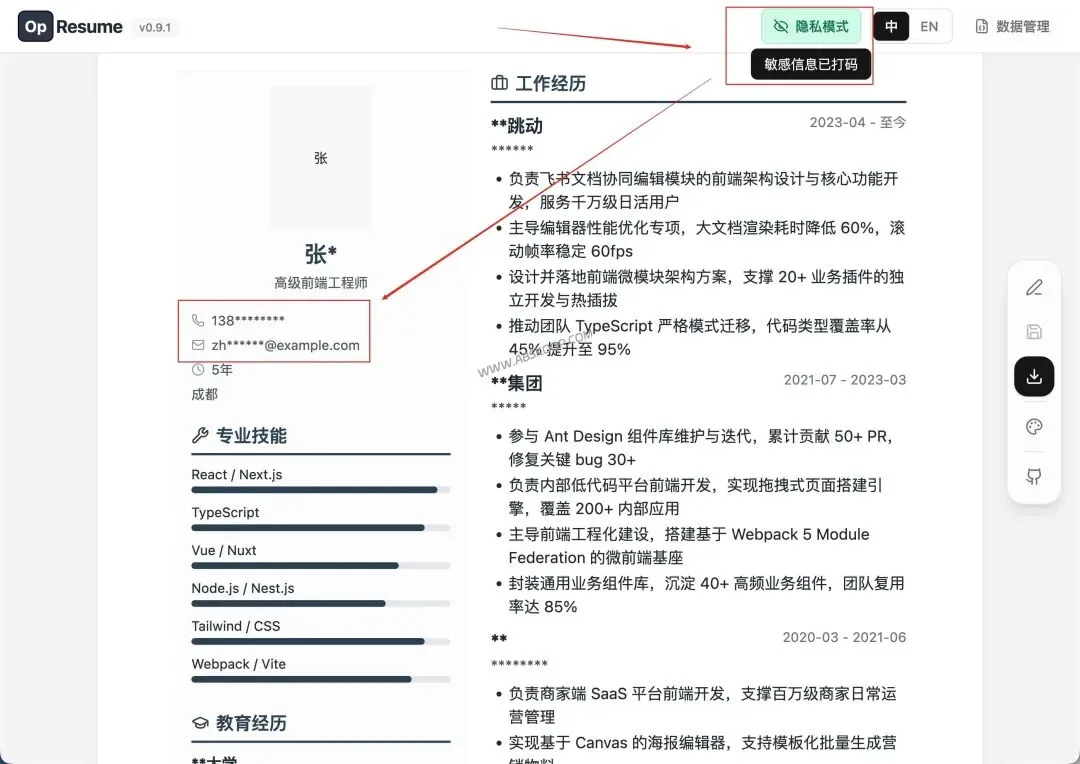 另外它还有一个比较实用的细节:隐私打码模式。很多技术人喜欢把简历发到 V2EX 或微信群里找同行帮忙 Review,但手动给各种截图打码很费事。OpResume 支持一键隐藏姓名、手机、邮箱等敏感信息,既能展示排版和项目经验,又规避了隐私暴露的风险。