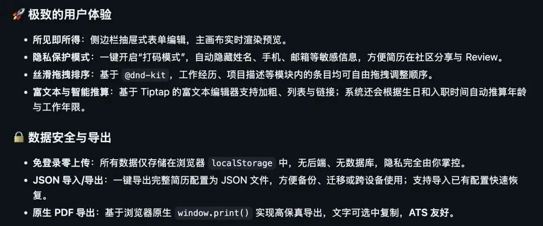 但如果你需要的是 AI 自动帮你润色工作经历、想要多设备云端自动同步,或者你是设计师想做一份视觉极其花哨的创意简历,那它显然无法满足需求,你可能需要寻找带 AI 润色、云同步或更强设计能力的工具。