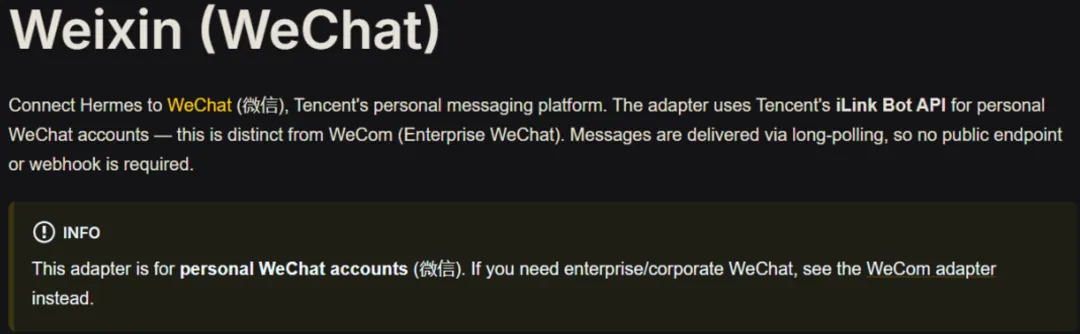 第三,它把微信接进来了。 这对中文互联网用户来说,是一个极强的信号。很多国外的 Agent 项目只支持 Telegram 或 Discord,停留在开发者圈层。但微信不一样,它是真正贴近日常工作流和生活沟通链路的入口。